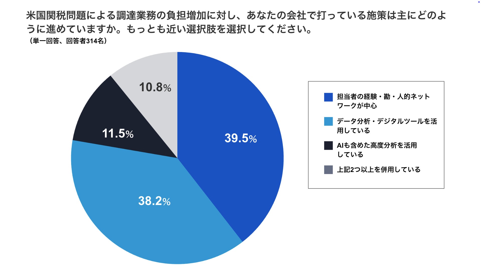 ・一方で、「調達データの整備・システム化(10.6%)」「社内の調達体制・人員の強化(9.6%)」など、中長期的な構造改革に踏み込む対策が下位となり、即効性のある対策が優先されている実態がうかがえます。