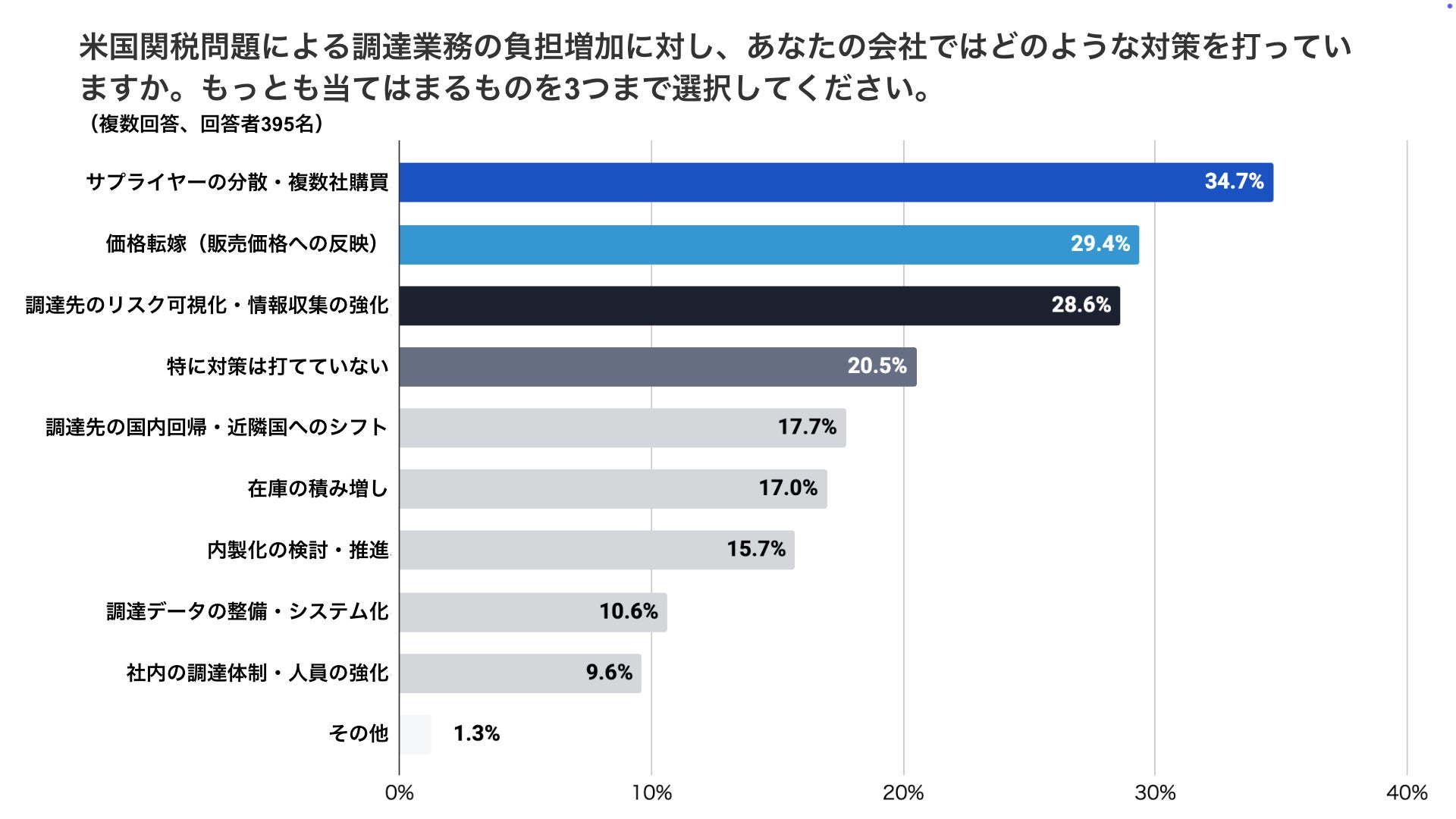・約8割の企業が何らかの対策を実施しており、最も多く選ばれたのは「サプライヤーの分散・複数社購買(34.7%)」次いで「価格転嫁(29.4%)」「調達先のリスク可視化・情報収集の強化(28.6%)」が続き、調達先の多元化とコスト対応を軸とした対策が主流となっています。
