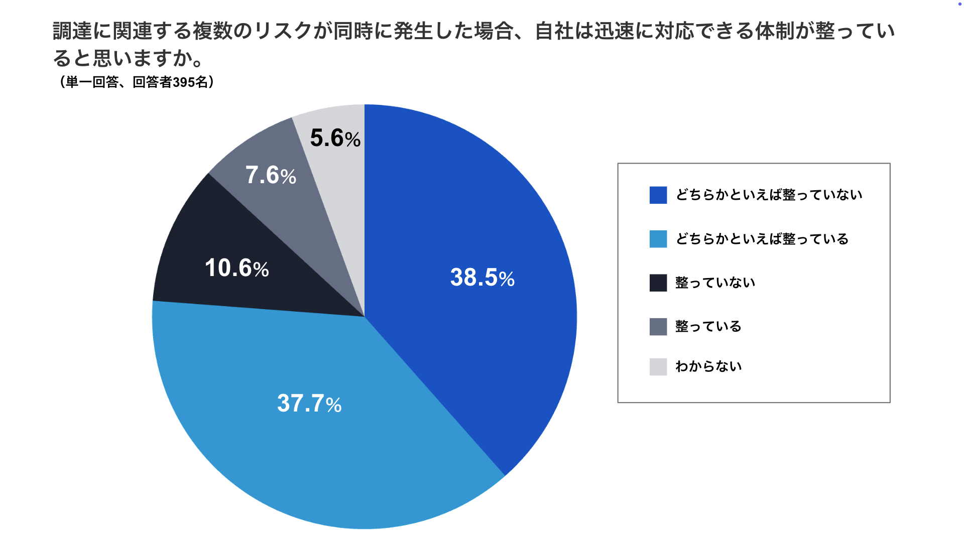 ・複数の調達リスクが同時発生した際に迅速に対応できる体制が「整っていない(10.6%)」「どちらかといえば整っていない(38.5%)」の合計は約5割(49.1%)に達しました。およそ半数の企業が、対応体制に不安を抱えている実態が浮き彫りとなりました。