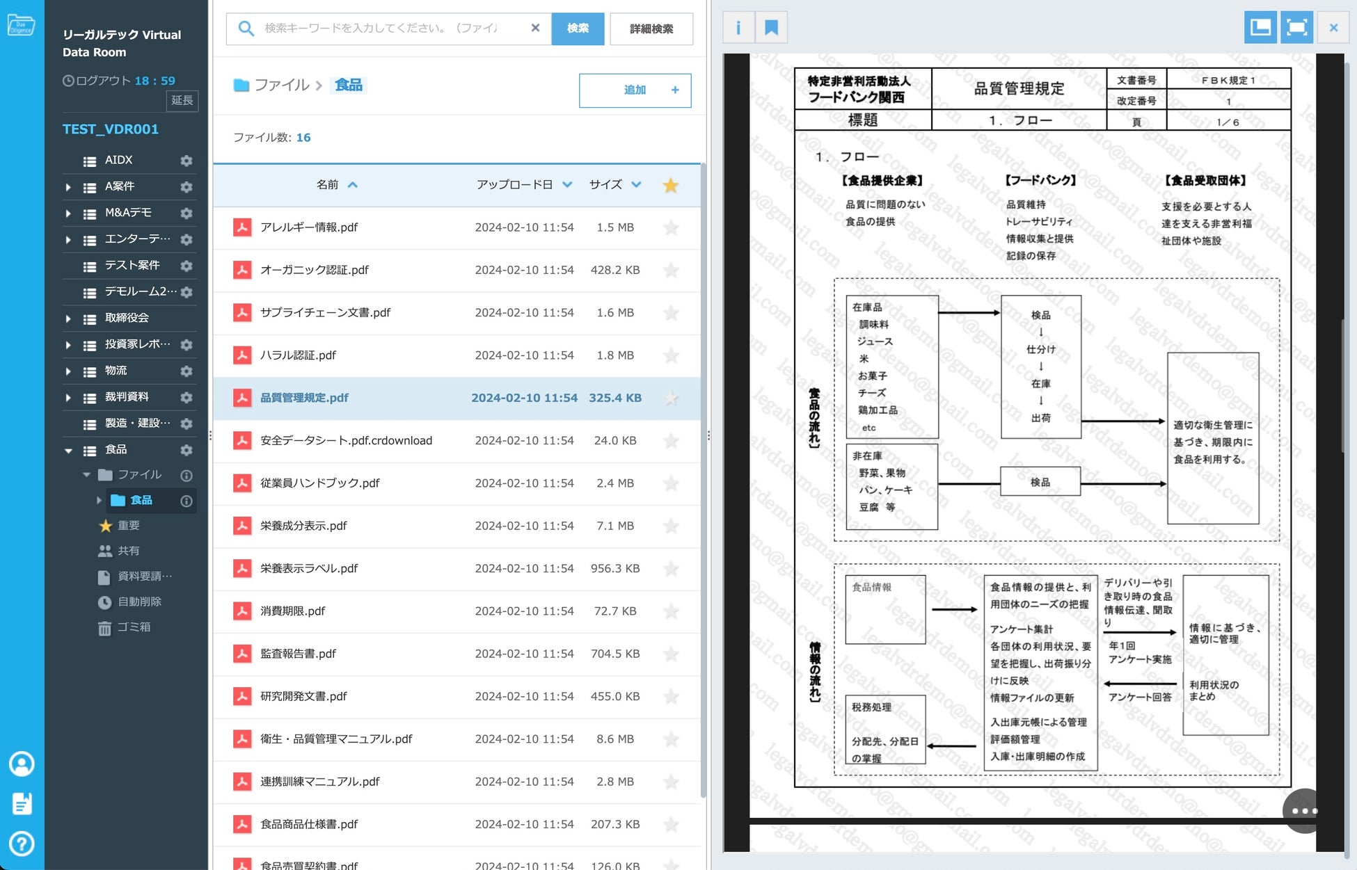 「リーガルテックVDR食品」(VDR: Virtual Data Room)は、機密情報の安全な共有、特に法律関連文書の交換、契約プロセス、M&A(合併・買収)取引、財務監査などに広く利用されています。VDRは食品業界におけるデータ共有の課題を以下のように解決することができます。