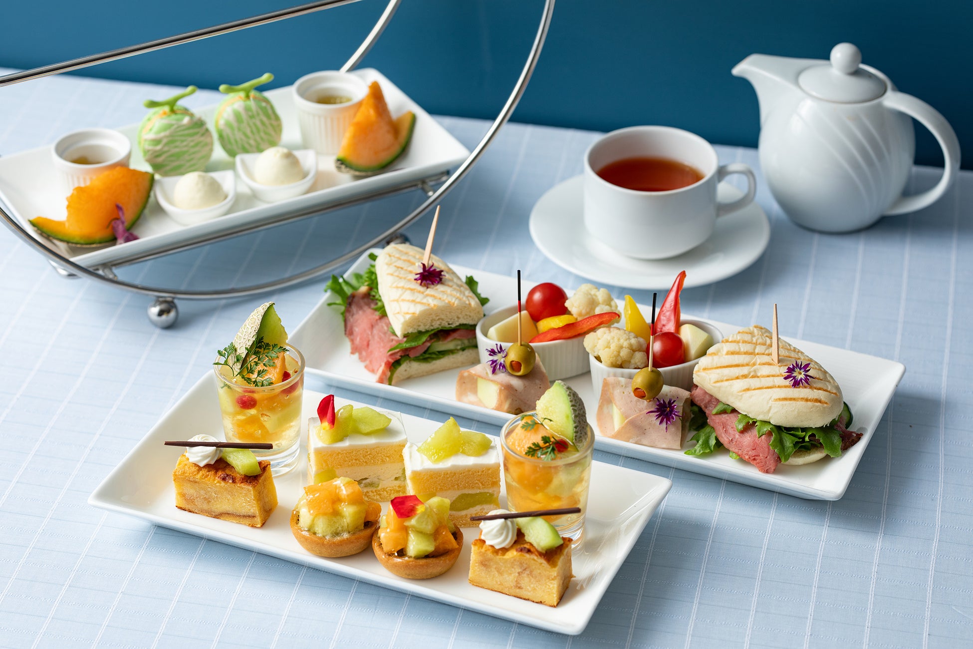 3段スタンドに並んだメロンづくしのスイーツや初夏にぴったりのセイボリーなどと約15種から選べるドリンク。地上100mから新宿の高層ビルを望む開放的な空間の中で、ヌン活をお楽しみください。
