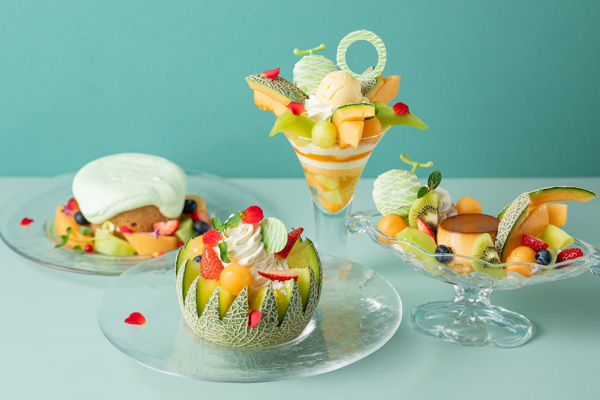 メロン半玉を器にした贅沢サンデーやまるでチーズケーキのような味わいパフェ、昔ながらの固めのプリン、まろやかなメロンクリームとふわふわほうじ茶のシフォンケーキなど魅惑のメロンスイーツ4品