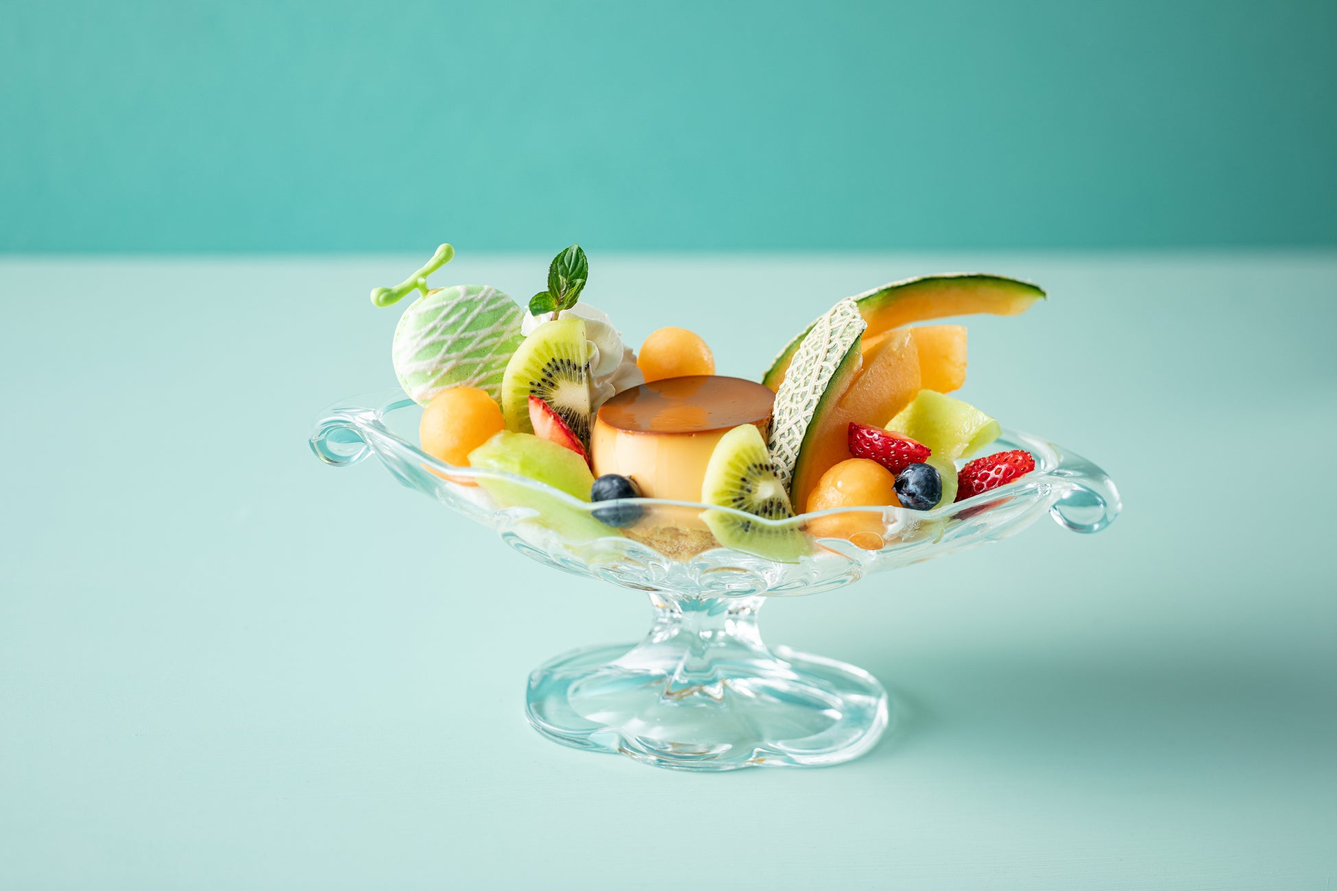 牛乳と全卵で作った昔ながらの固めのプリンが魅力の“メロンのプリンア・ラ・モード”は、赤肉と青肉のメロンやキウイ、苺を贅沢に飾りました。