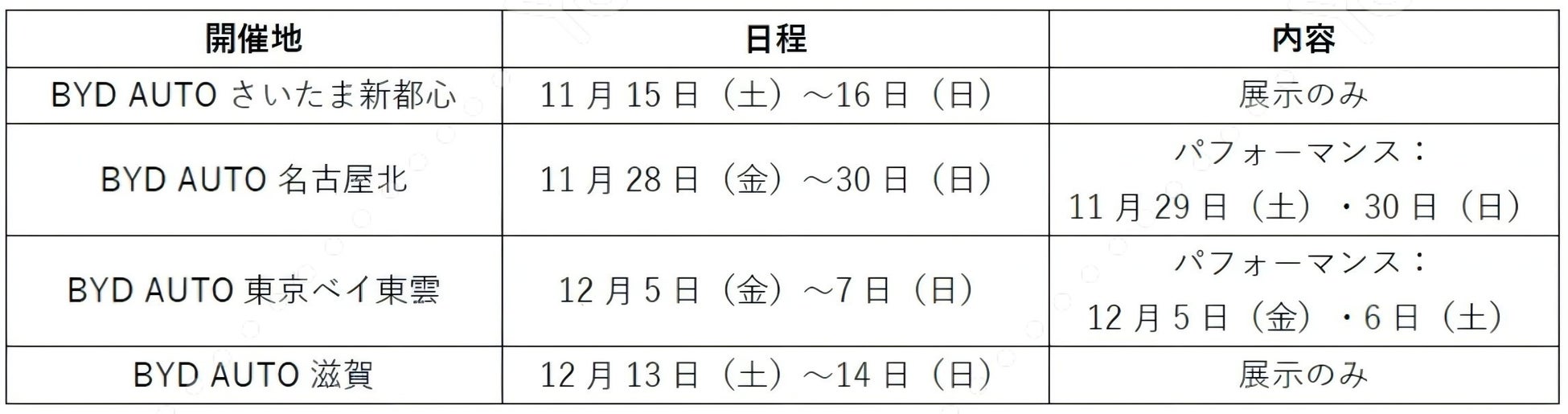 BYD Auto Japan株式会社(本社:神奈川県横浜市、代表取締役社長:東福寺 厚樹、略称:BAJ)は、先に開催されたJapan Mobility Show 2025(以下:JMS)でジャパンプレミアとして出展したBYDのハイエンドブランド「YANGWANG(ヤンワン)」の電動スーパーカー「U9」のディーラーキャラバンを下記スケジュールで実施。各販売店を巡りながら、実車をご覧いただくだけでなく、JMSで披露したダンスパフォーマンスを行うなど、多くのお客様にBYDの最新技術を身近に体感していただきます。