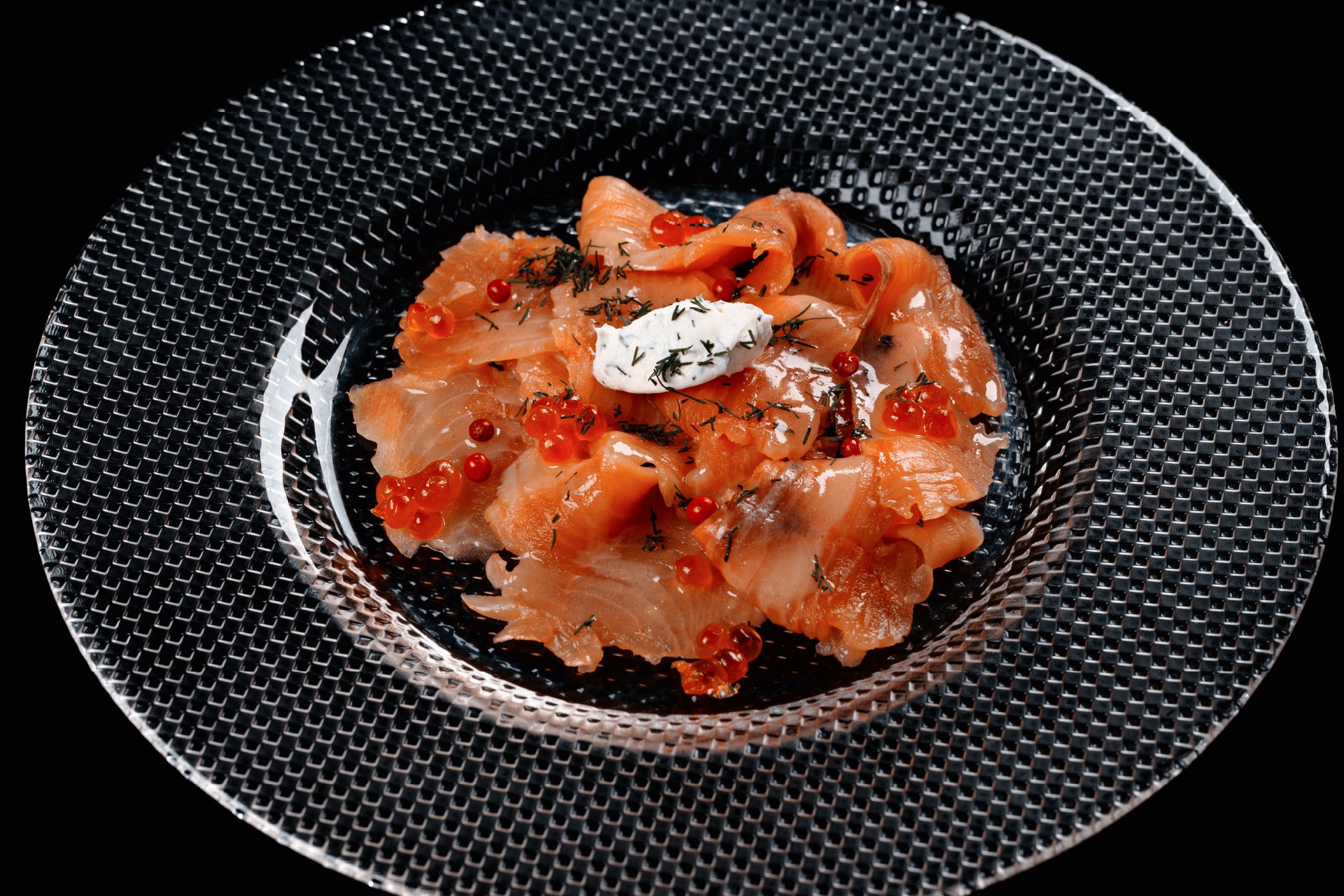 燻製にした桜マスのカルパッチョ いくらとサワークリーム