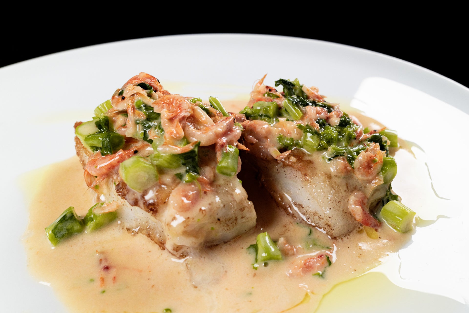 春から初夏にかけて旬を迎えるカレイをムニエルに仕立て、桜海老と菜の花を使った白ワインソースで仕上げました。