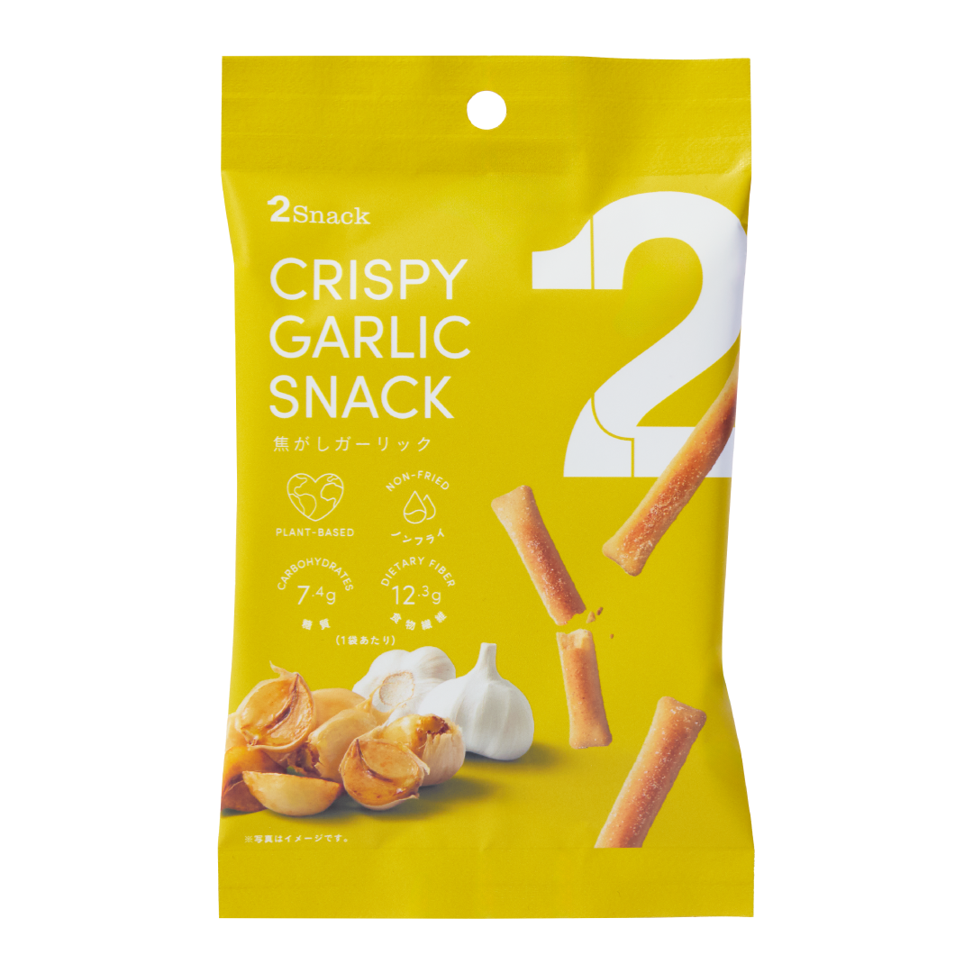 3 種のガーリック原料を使用。焦がしガーリックの香ばしい風味で、クセになる味わいです。ノンフライで仕上げ、クリスピーで軽やかに食べられます。