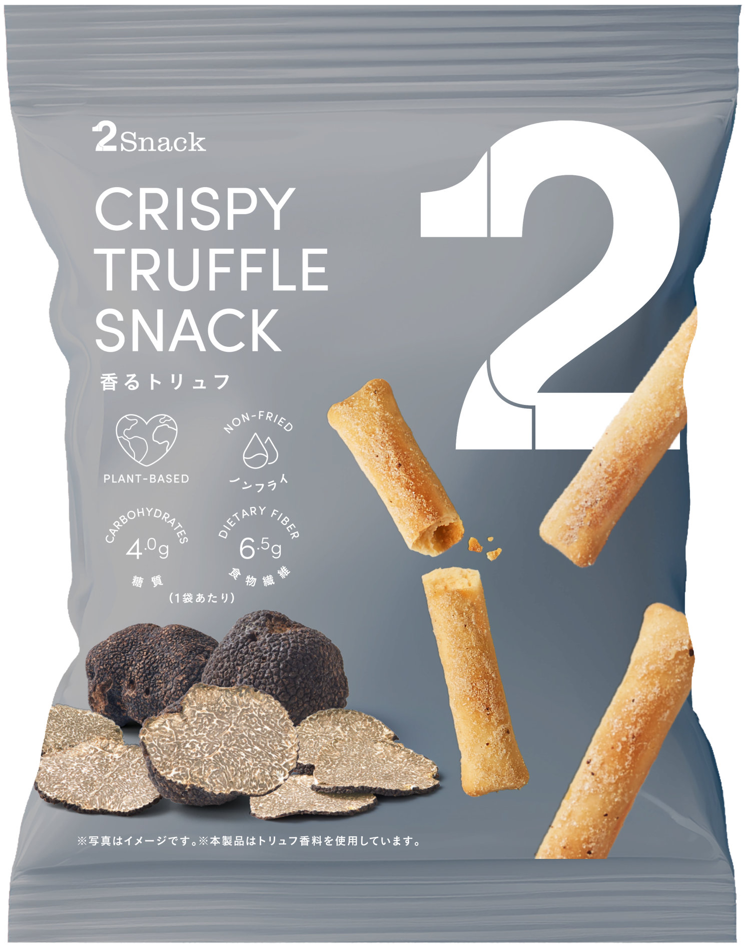 ヨーロッパ産黒トリュフ入りのトリュフ原料を使用。トリュフが香りやみつきになる味わいです。ノンフライで仕上げ、クリスピーで軽やかに食べられます。食物繊維6.5g※3で、カラダにもうれしいスナックです。