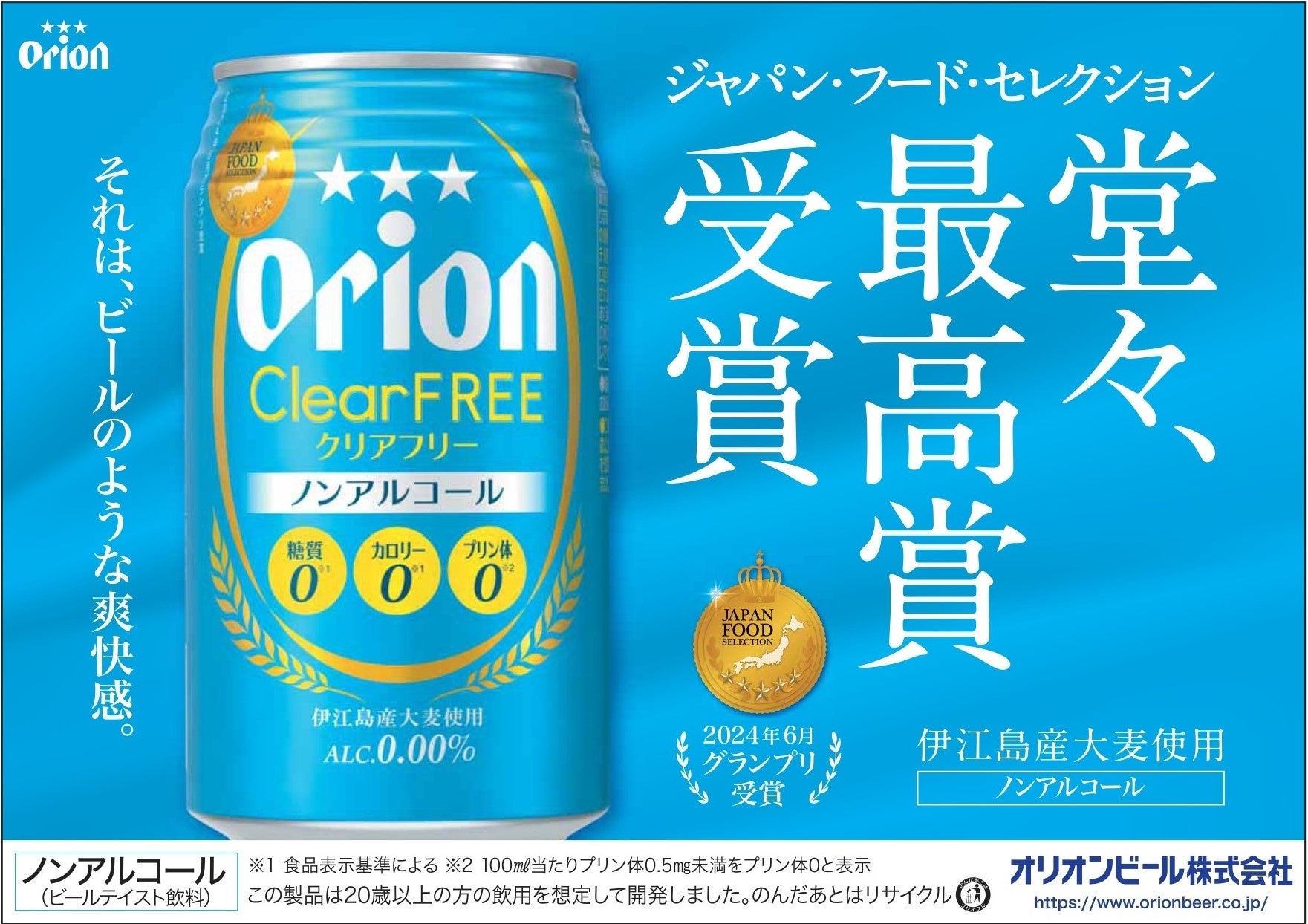 オリオンビール株式会社(本社:沖縄県豊見城市、代表取締役社長 兼 執行役員社長 CEO 村野 一)は、2013年より発売しているノンアルコール飲料「オリオン クリアフリー」が、2024年6月に食の専門家資格を持つフードアナリストによる審査評価制度「ジャパン・フード・セレクション」でグランプリ(最高賞)を受賞したことをお知らせいたします。これを記念し、11月下旬よりオリオン クリアフリーの受賞記念缶を順次発売いたします。