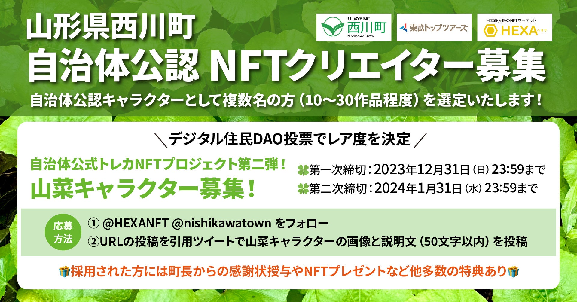山形県西川町が地方創生に力を貸してくれる自治体公認NFTクリエイターを募集!山菜トレカNFTのキャラクターを募集し、デジタル住民DAO投票でレア度を決定。HEXA(ヘキサ)