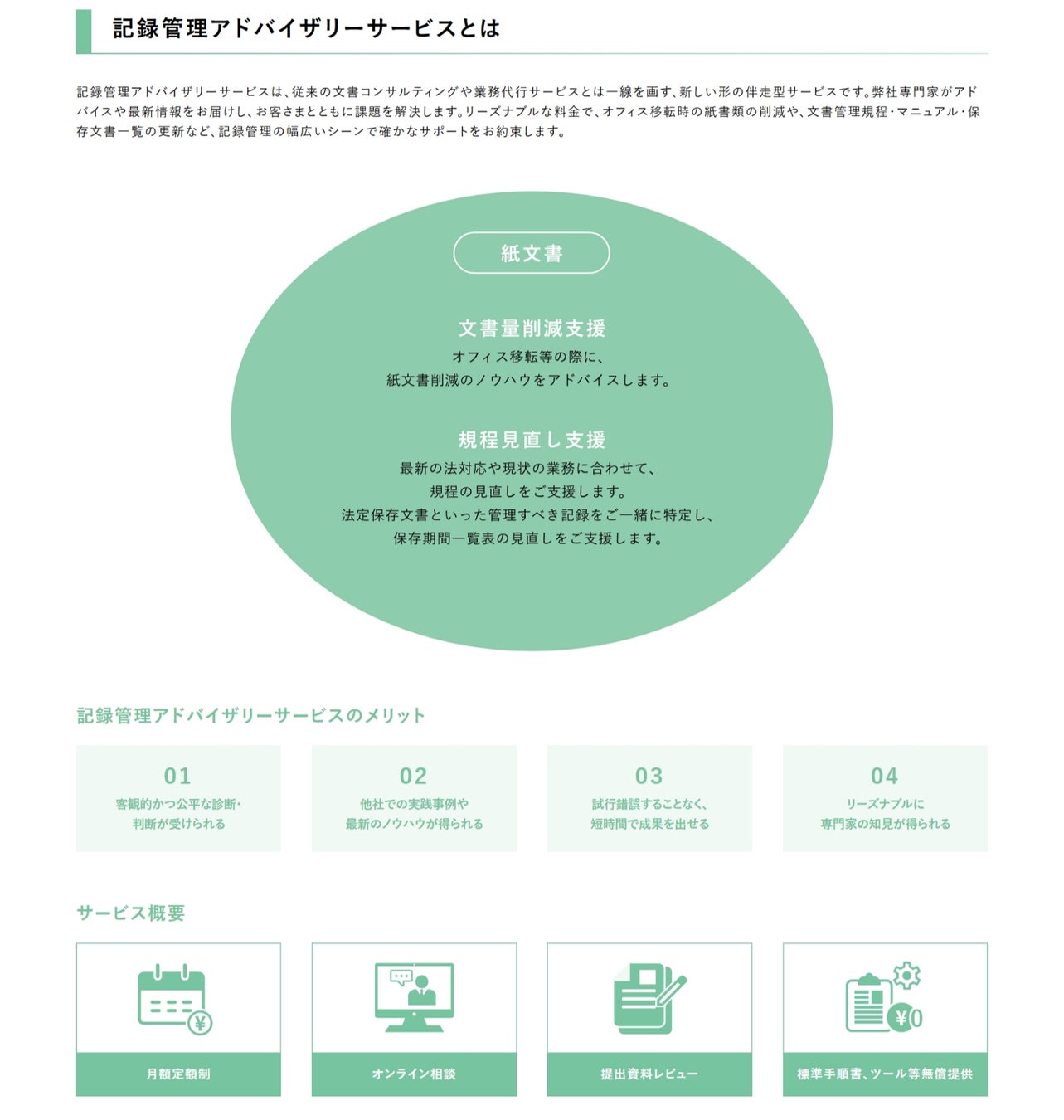 ・気軽に利用できる価格帯:月額6万円のライトなサービスとして、従来の重厚な文書管理コンサルティングサービスよりも気軽に専門家の支援を受けられます。