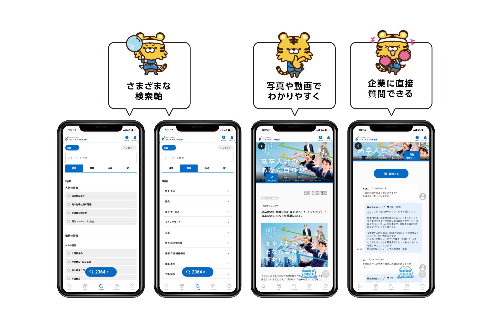 ●「会社の特徴」「職種」「地域」など高校生が気になる軸で、学校に届かない求人も検索ができます