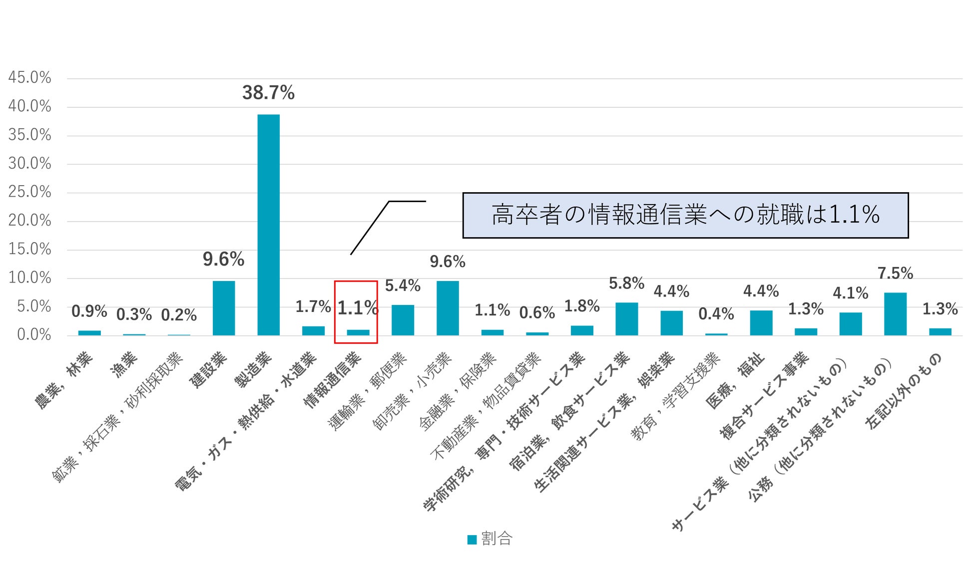 製造業に就職する高校生が約4割近く占める一方で、情報通信業への就職は約1.1%(※5)と少ない現状です。