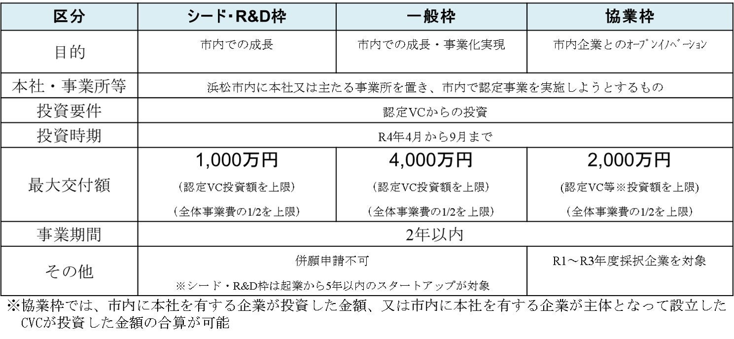 本事業は、急成長を目指す浜松市内のスタートアップが必要とする資金をVCの投資活動と協調して支援するとともに、スタートアップの経営基盤の強化や財務管理体制の整備についても併せて支援するものです。今年度事業では、シード期のスタートアップの支援や、市内企業とスタートアップとの協業によるイノベーション創出の促進を目指して、「シード・R&D枠」、「一般枠」、「協業枠」の3つの区分を設けました。