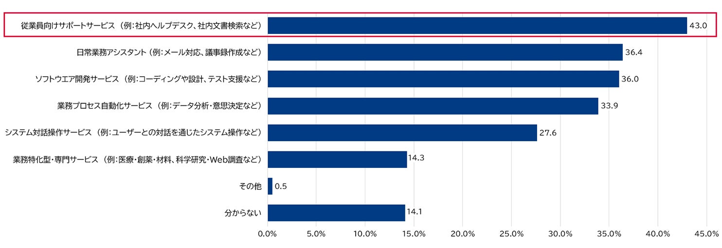 今後、自社に導入したいAIエージェントサービスでは、「従業員向けサポートサービス(社内ヘルプデスク、社内文書検索等)」が最上位。次に、「日常業務アシスタント」「ソフトウエア開発サービス」「業務プロセス自動化サービス」が続く