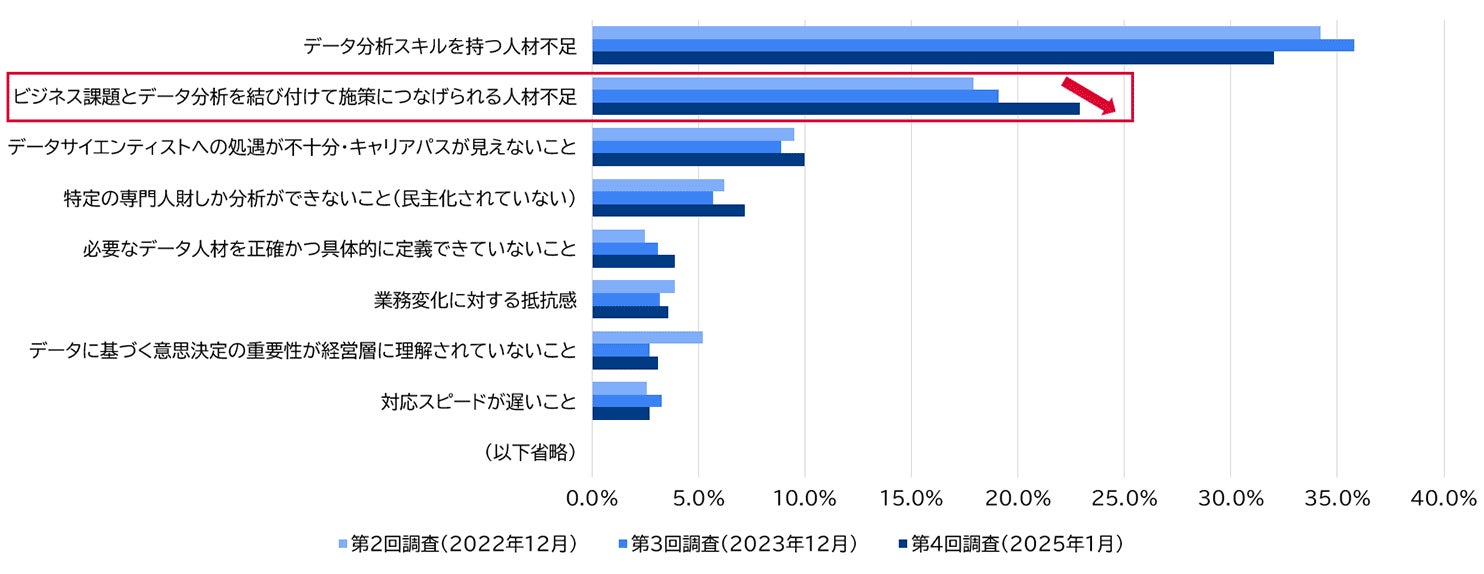 DX人材の課題では、「データ分析スキルを持つ人材不足」が減少した一方で、「ビジネス課題とデータ分析を結び付けて施策につなげられる人材不足」が増加
