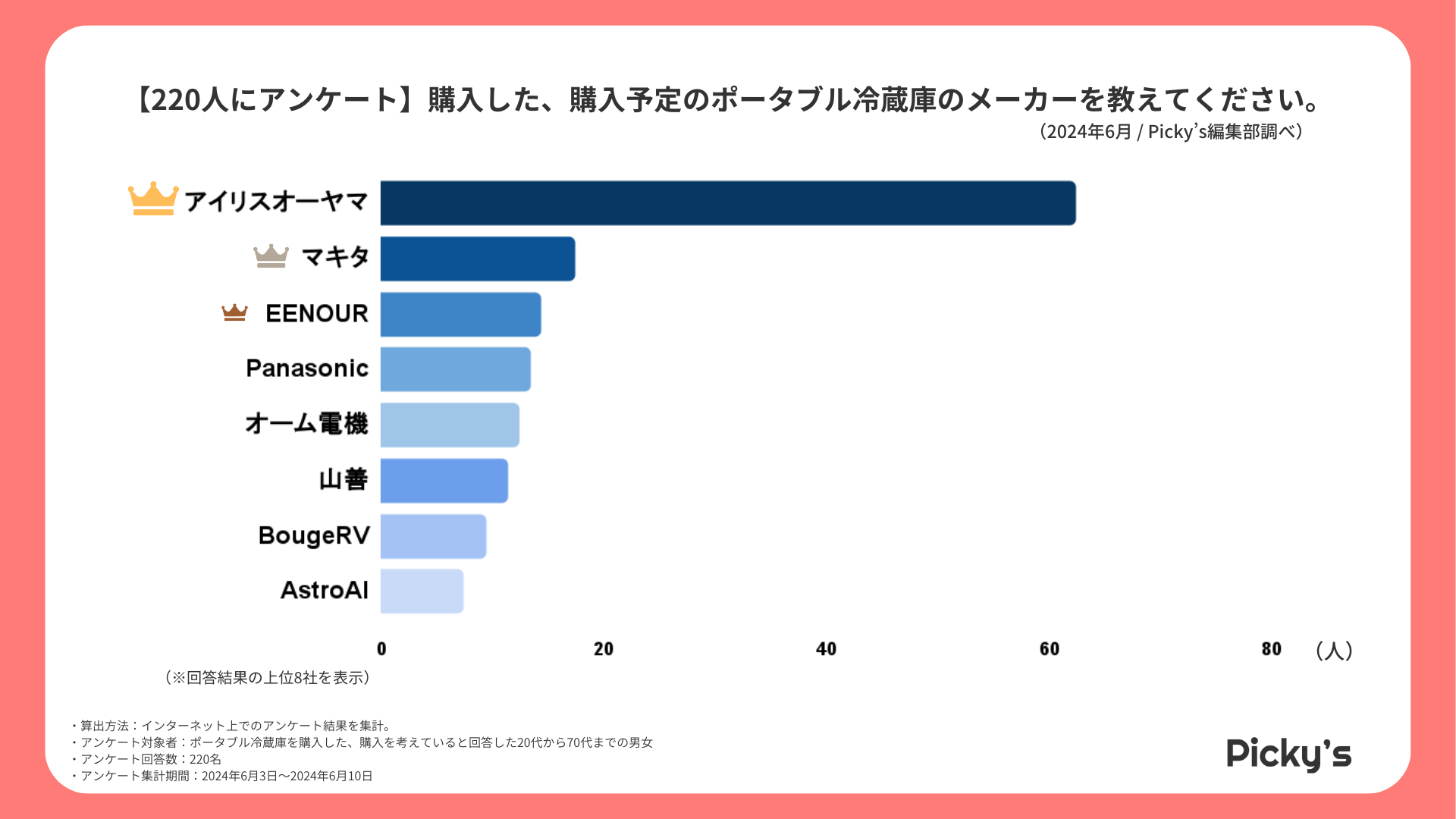 「Picky’s」は、インターネットショッピングにおいて、購入前に試せない・選ぶべきものがわからないという課題の解決を目標に、あらゆる商品のおすすめランキングや検証レビューを紹介するサイトです。このたびPicky’s(https://rentry.jp/)では、夏需要に先駆けて、ポータブル冷蔵庫についてインターネット上でアンケート調査を行いましたので発表いたします。