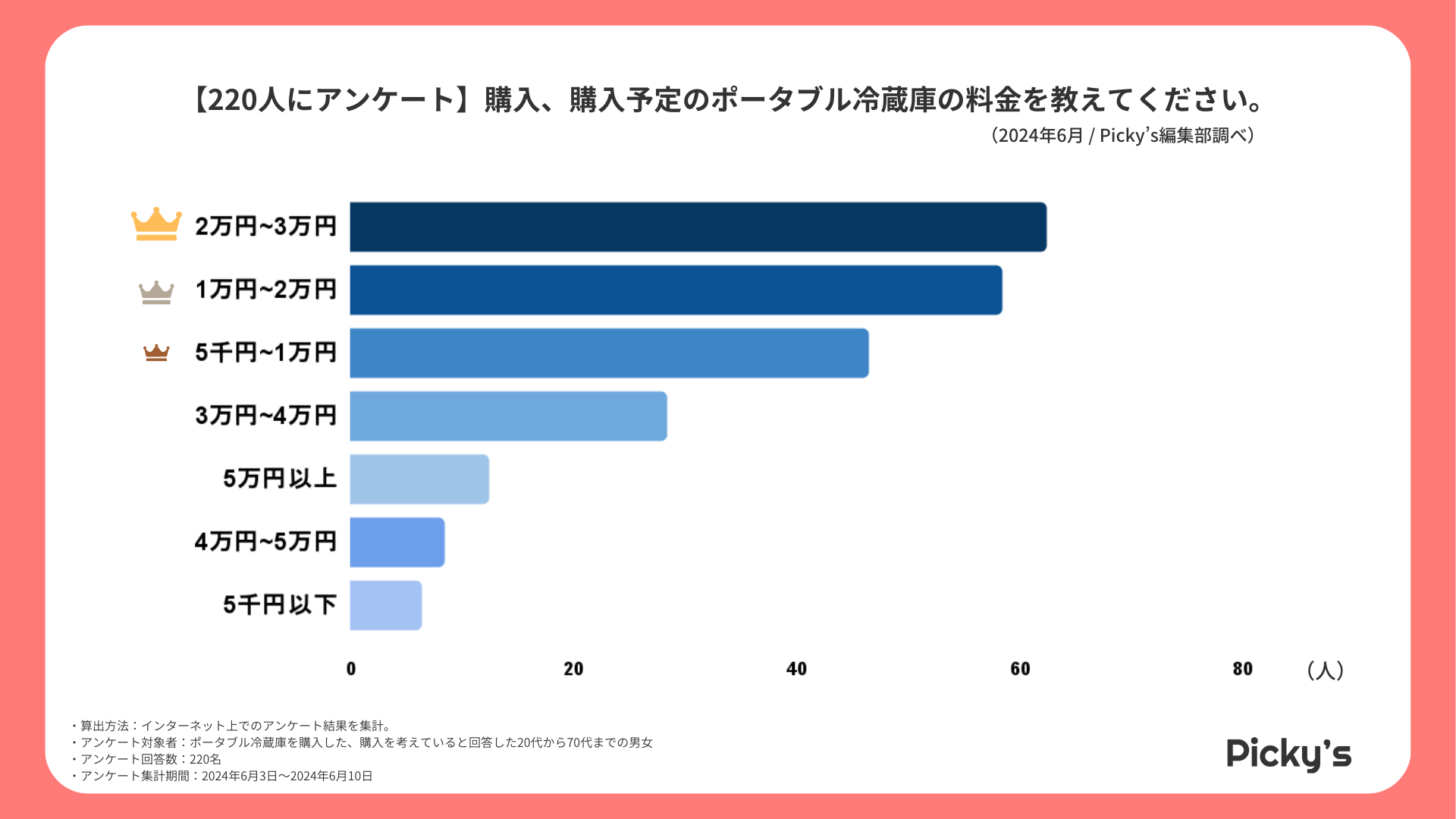 購入・購入予定のポータブル冷蔵庫の価格帯として最も多いのは「2万円3万円」(62票)で、多くの回答者がこの価格帯の製品を選んでいます。