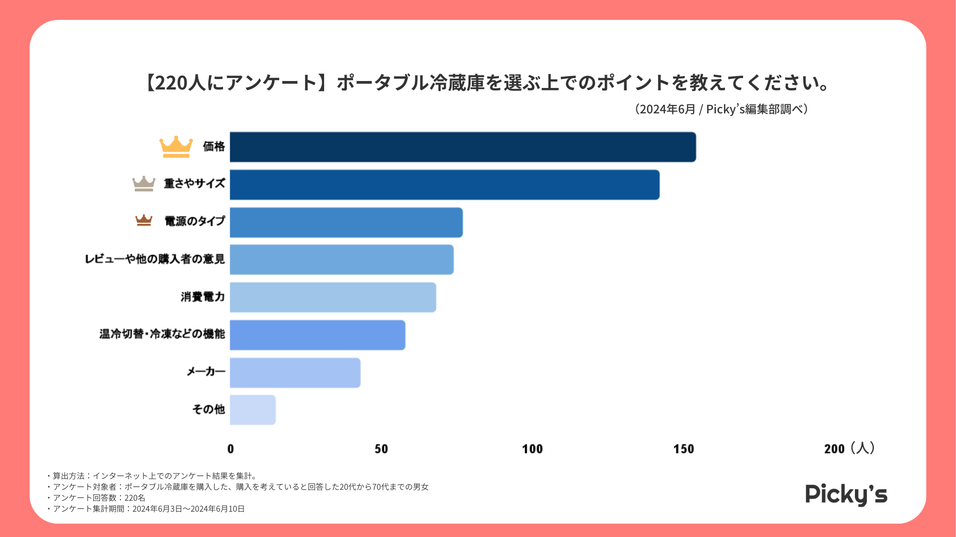 アンケート結果によると、ポータブル冷蔵庫を選ぶ際の最も重要なポイントは「価格」(153票)で、多くの消費者がコストを重視しています。