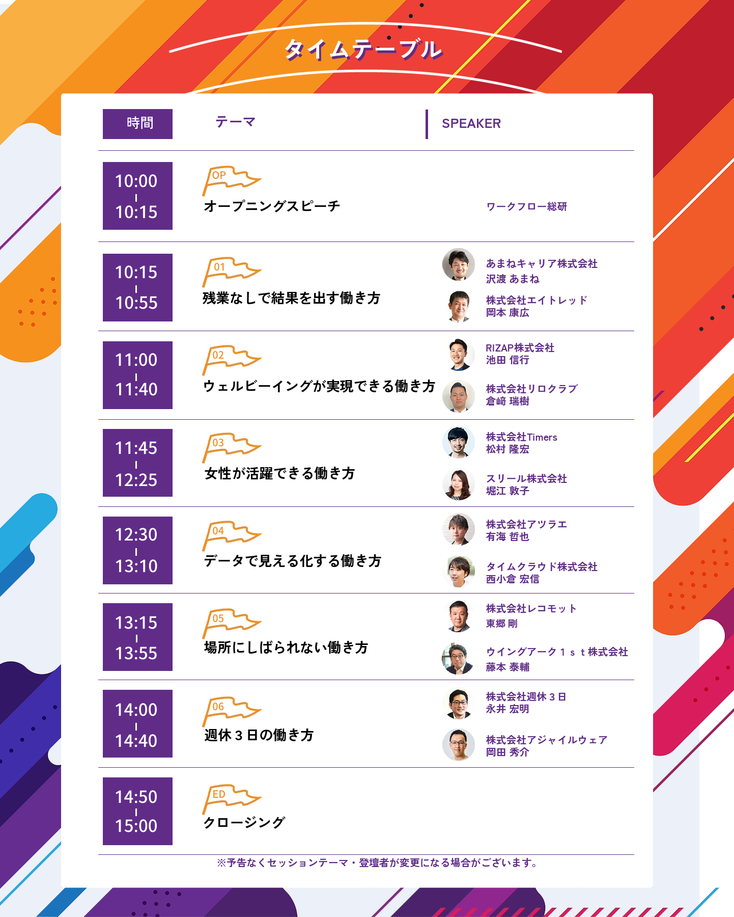 そこで、本カンファレンスでは、12名の有識者が一同に集まり、6つの視点での「ワクワクする働き方」に焦点をあて、トークセッションを行うことで、新しい時代の職場における可能性を広げ、参加者の職業生活に前向きな影響を与えることを目指します。