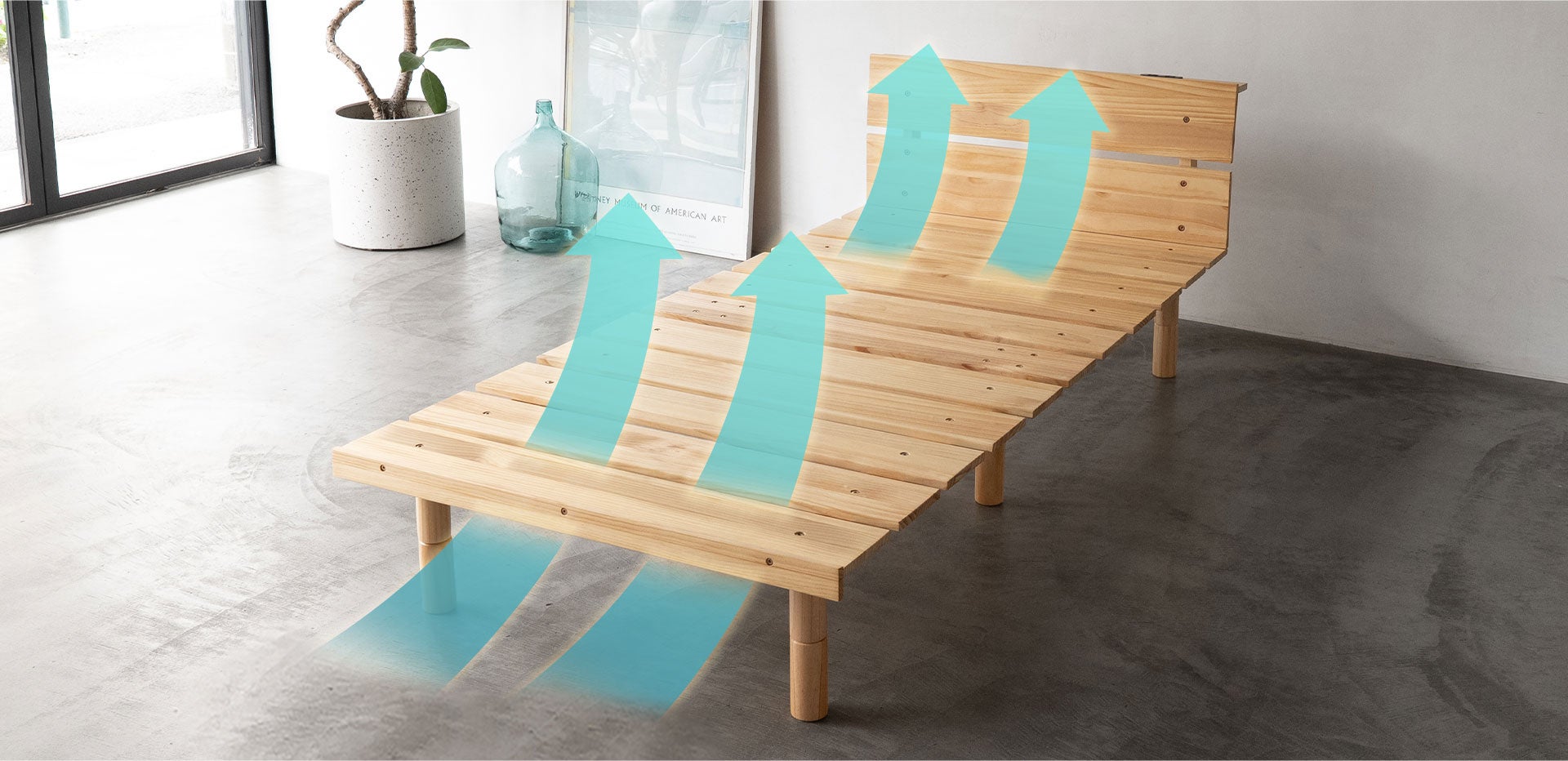 マットレスやお布団には想像以上の汗や湿気が溜まります。高温多湿の日本では「すのこベッド」は欠かせません。通気性の良いすのこベッドは常に新鮮な空気を寝具に送り込むことで、カビやニオイの原因となる湿気を溜まりにくくします。