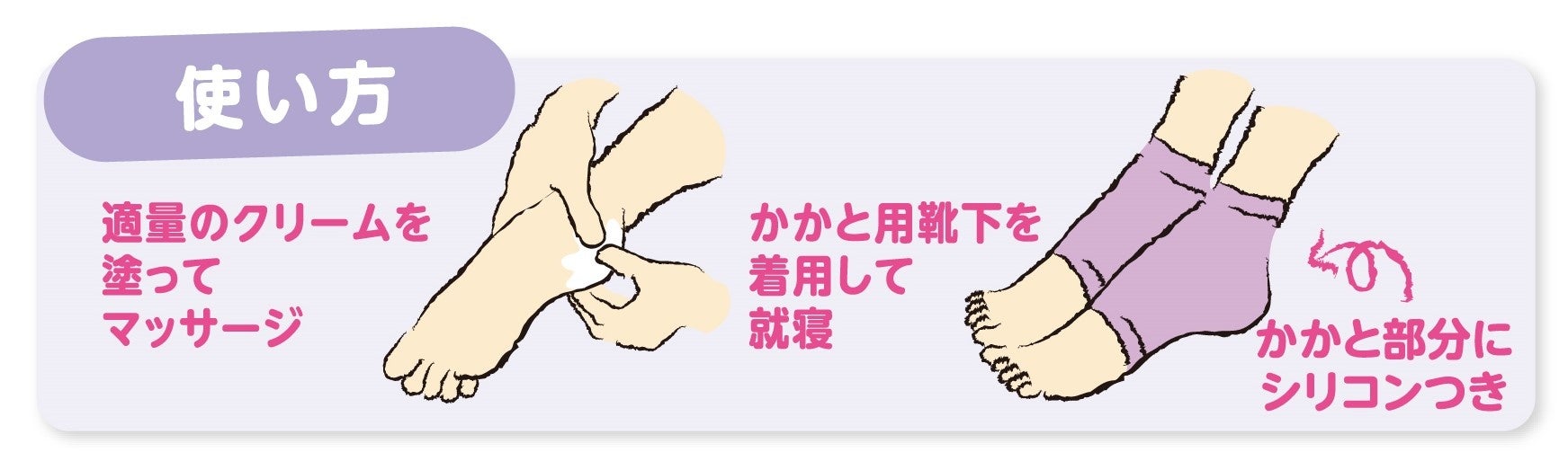 保湿クリームは、ひび割れ防止(※2)の有効成分を3種類配合(※3) 。さらに、保湿後の潤いをしっかりキープできる、かかと用のシリコンソックスが限定カラーで付属。就寝前にクリームを塗って履いて寝るだけで、かかとの乾燥対策が手軽に続けられます。
