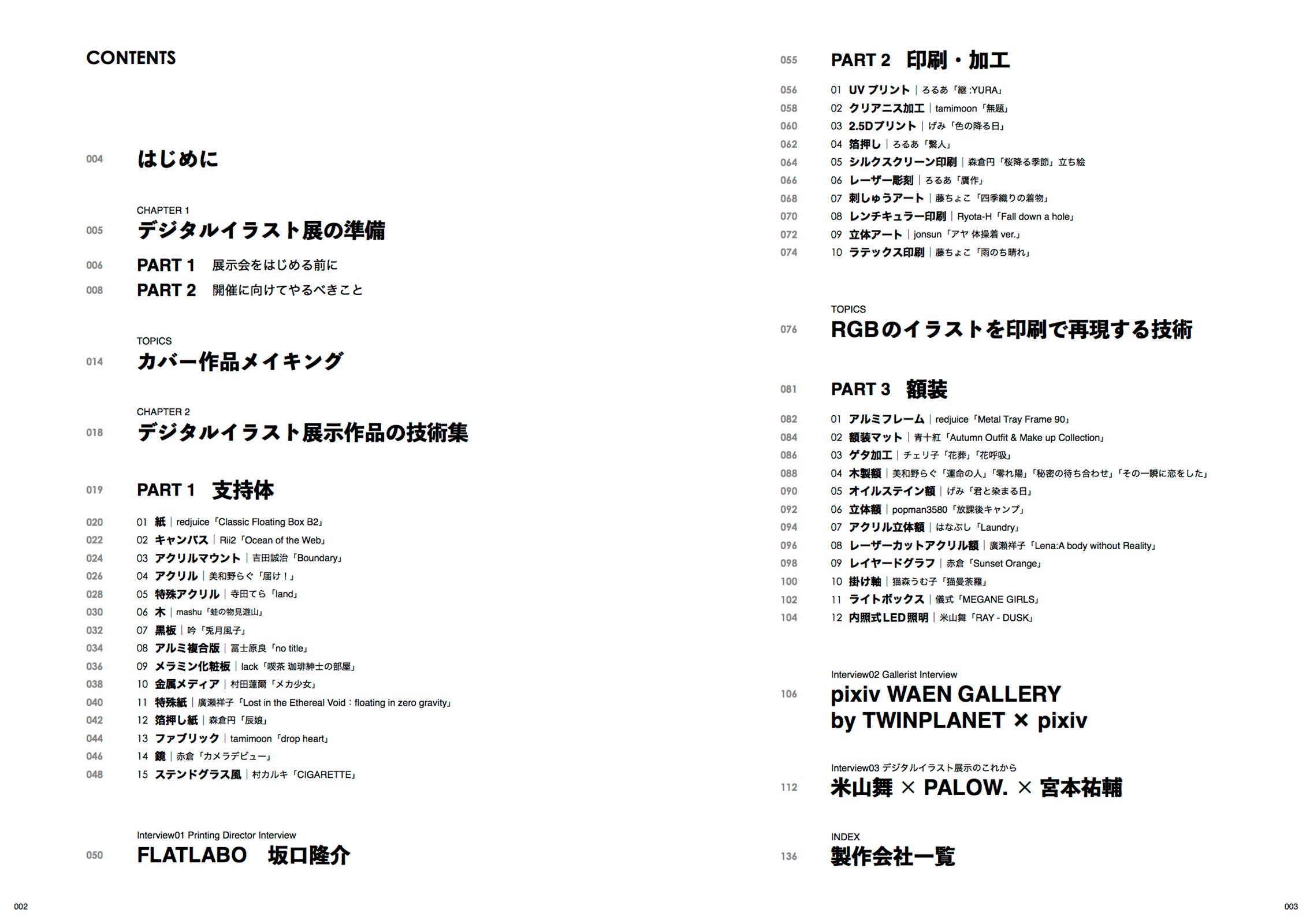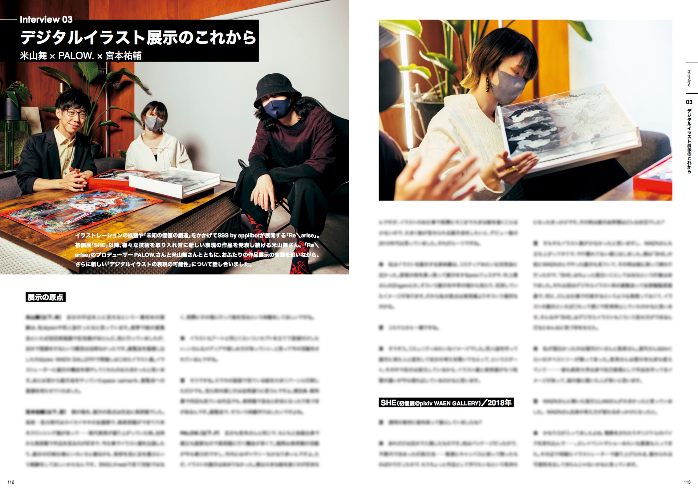 デジタルイラスト展を支えるFLATLABO、pixiv WAEN GALLERYのインタビュー、巻末にはさまざまな印刷技術と表現方法を開拓してきたSSS by applibotの米山舞さん、PALOW.さんとの特別対談「デジタルイラスト展示のこれから」とその作品群を収録。