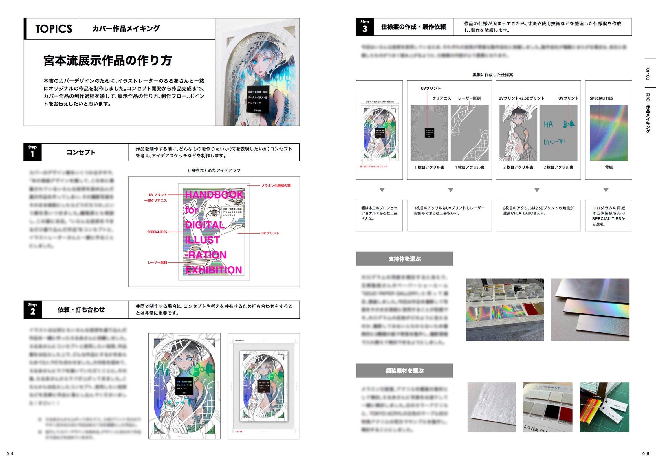 事例集では人気イラストレーターのかっこいい展示作品を紹介しながら、その手法・技術を詳しく解説しています。