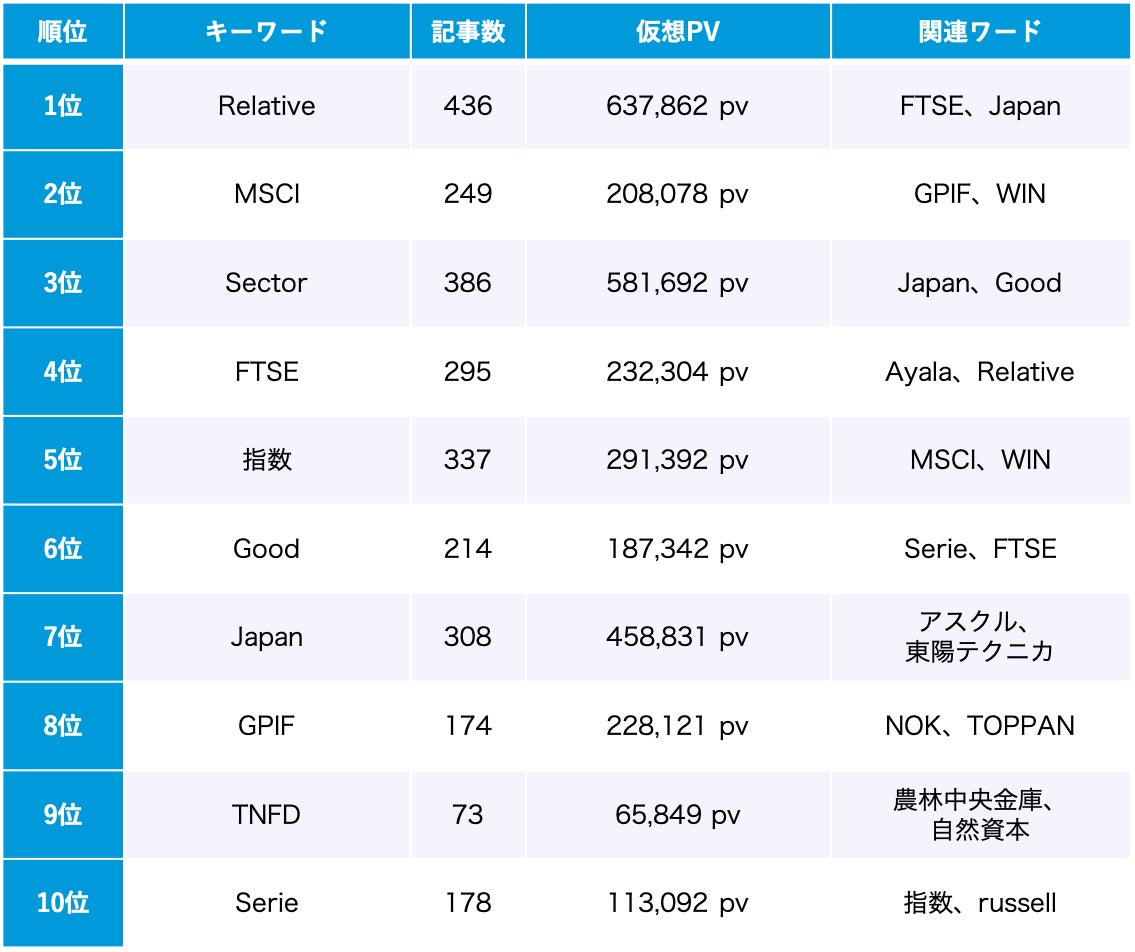 ランキング全体で大部分が代表的なESG投資指数「FTSE Blossom Japan Index」「FTSE Blossom Japan Sector Relative Index」「FTSE4Good Index Series」の話題。これらの構成銘柄に選定された企業のプレスリリースがランキングの大半を占めています。