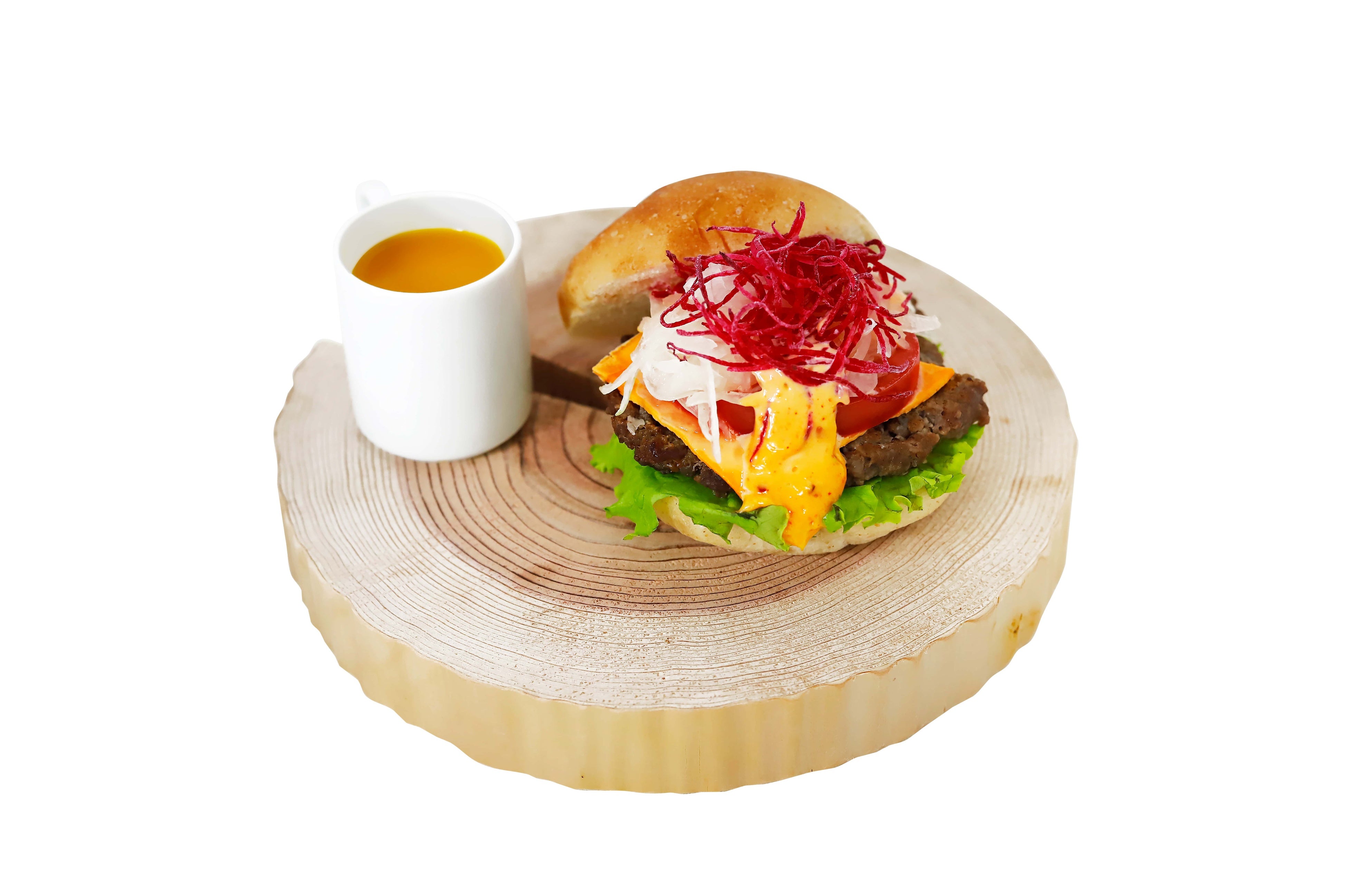バンズは、通常廃棄されてしまう京都・美山牛乳のホエイと国産全粒粉を加え、伏見区のベーカリーがオリジナルで作成。全てのハンバーガーには、その日の野菜の皮や芯を含め丸ごと使用し、旨味を最大限引き出すと共に、アップサイクルにもなる「大地丸ごとスープ」が付きます。また、四季折々の野菜を使用したサラダバーも新たに設置。ハンバーガーとセットにすることで、お得に楽しむこともできます。その他にも、バーガーの提供皿には、“ローカル”を感じていただくため、京都産の北山杉の間伐材で作った天然の磨き丸太を採用しています。
