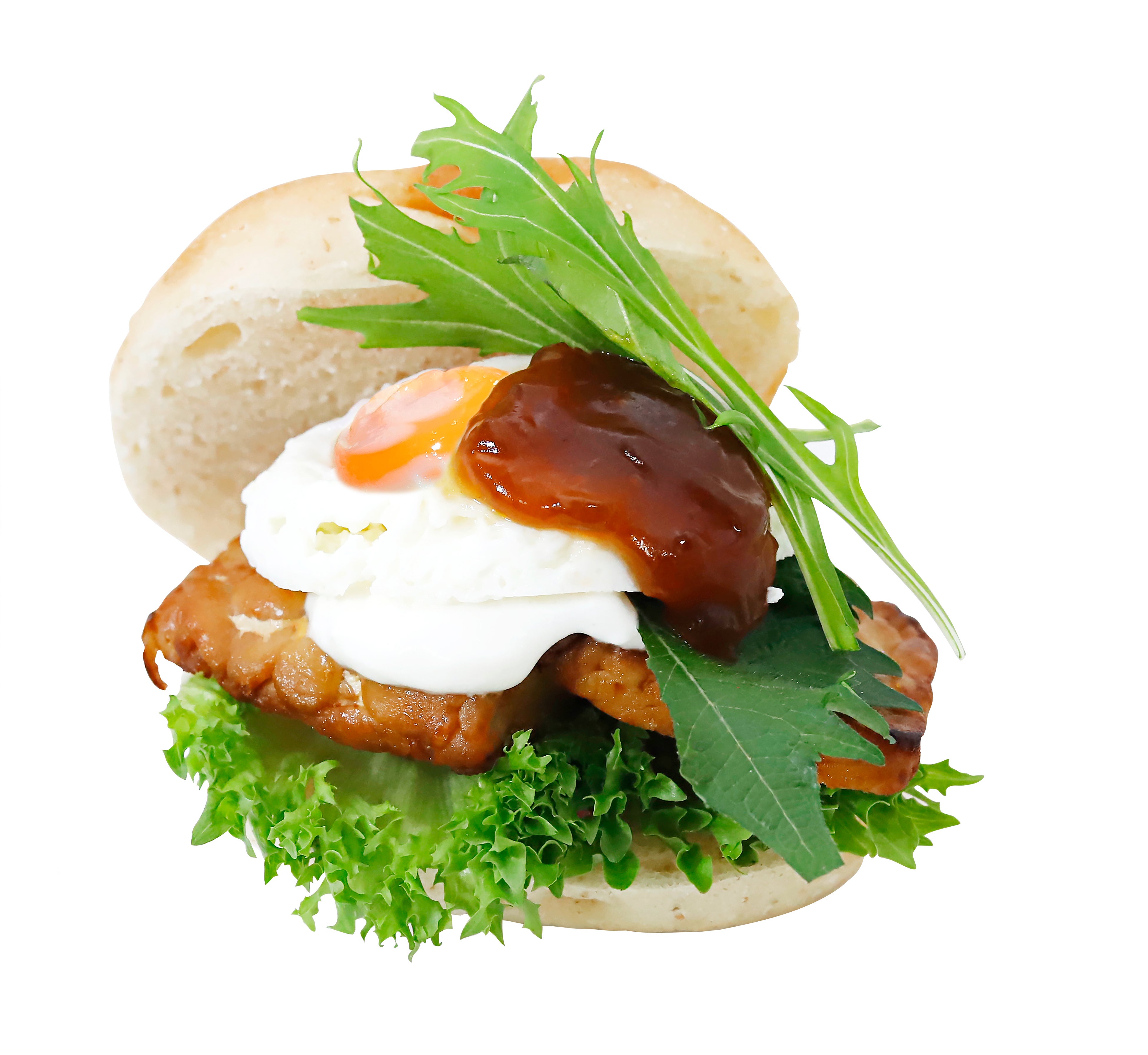大豆発酵食品のテンペをはさみ、ヘルシーかつ食べ応え抜群のハンバーガーです。京丹後の老舗醤油店「小野甚味噌醤油醸造」の酒ひしおを贅沢に照り焼きソースにし、京都宇治産の平飼い卵の目玉焼きを挟んだ和風バーガーです。
