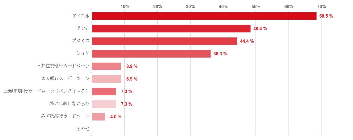 SMBCモビットと同じ大手の消費者金融を比較対象としている人が多かった。SMBCモビットの金利はもちろん、審査や手続きの利便性・スピードなどを比べていると考えられる。