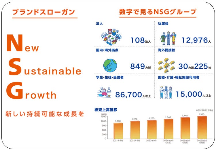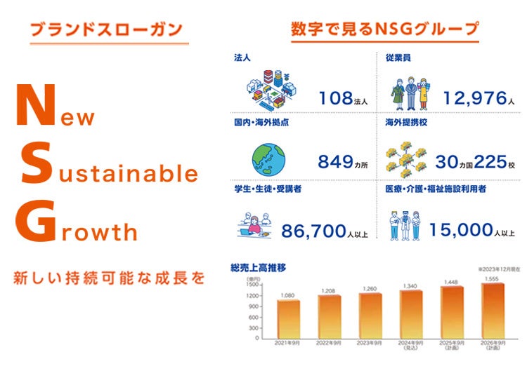 NSGグループの事業は、教育と医療・福祉・介護を中核としつつ、建設・不動産、商社、広告代理業、スポーツ、食・農、エンタテイメント等にも展開されています。同グループの原点は、1976年に設立された、学習塾などを運営する小さな民間教育機関でした。地域社会のニーズに応えて業容の拡大を続けた結果、108法人を傘下に置くグループへと成長し、1万2千人を超える規模の雇用を地域にもたらしました。