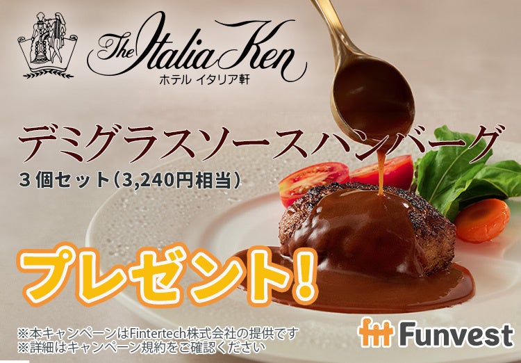 【A賞】300万円以上の出資でもれなく【B賞】抽選で5名様に「ホテルイタリア軒 デミグラスソースハンバーグ3個セット(3,240円相当)」をプレゼント!