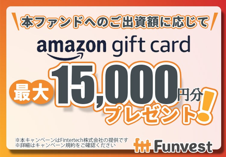 本ファンドへ出資していただいた投資家の皆様を対象として、出資額に応じて最大15,000円分のAmazonギフトカードをプレゼントするキャンペーンも併せて実施いたします。