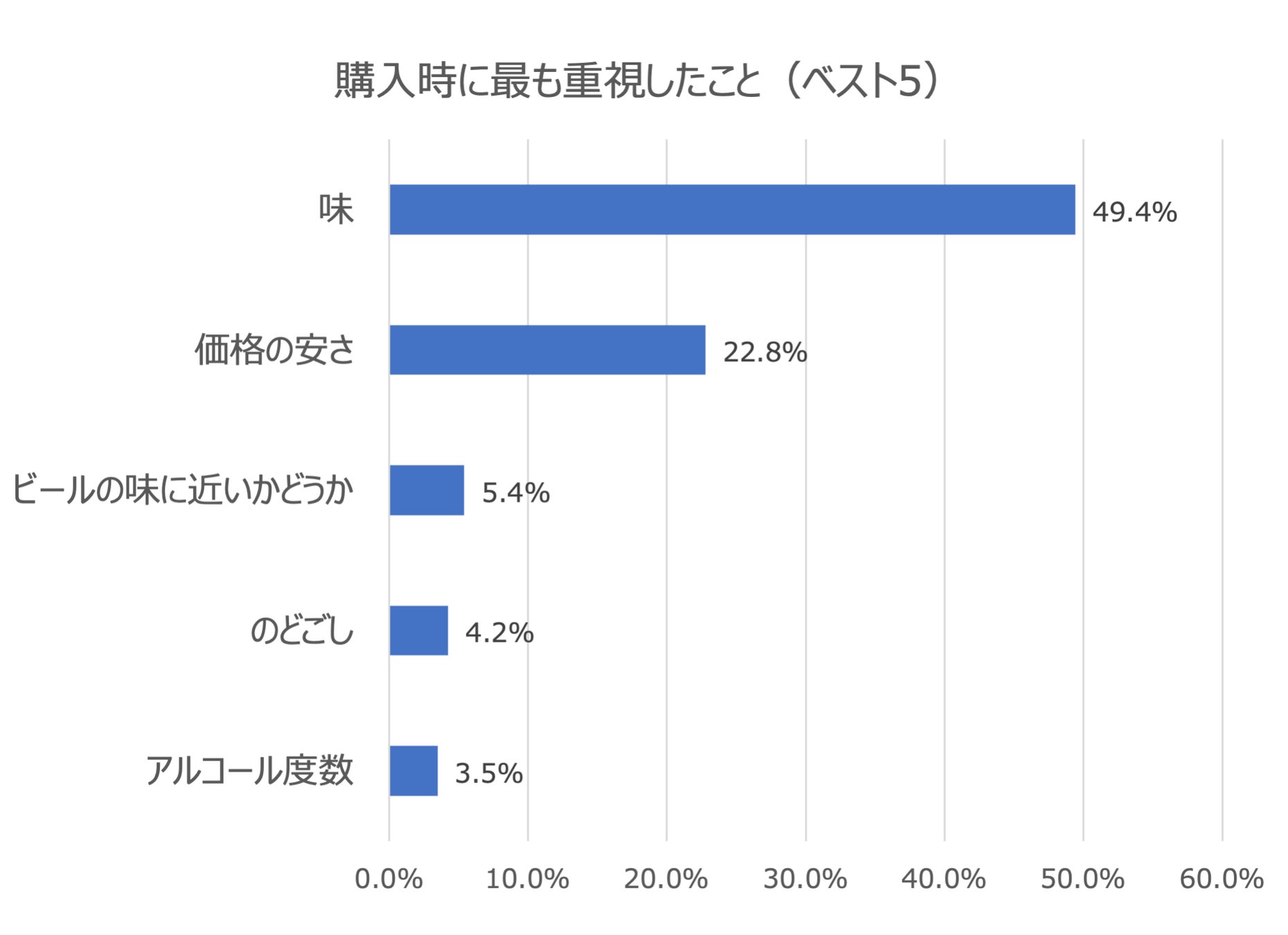 新ジャンルの購入時に最も重視したこと「味」「価格の安さ」「ビールの味に近いかどうか」「のどごし」「アルコール度数」が上位に(上記グラフ)。
