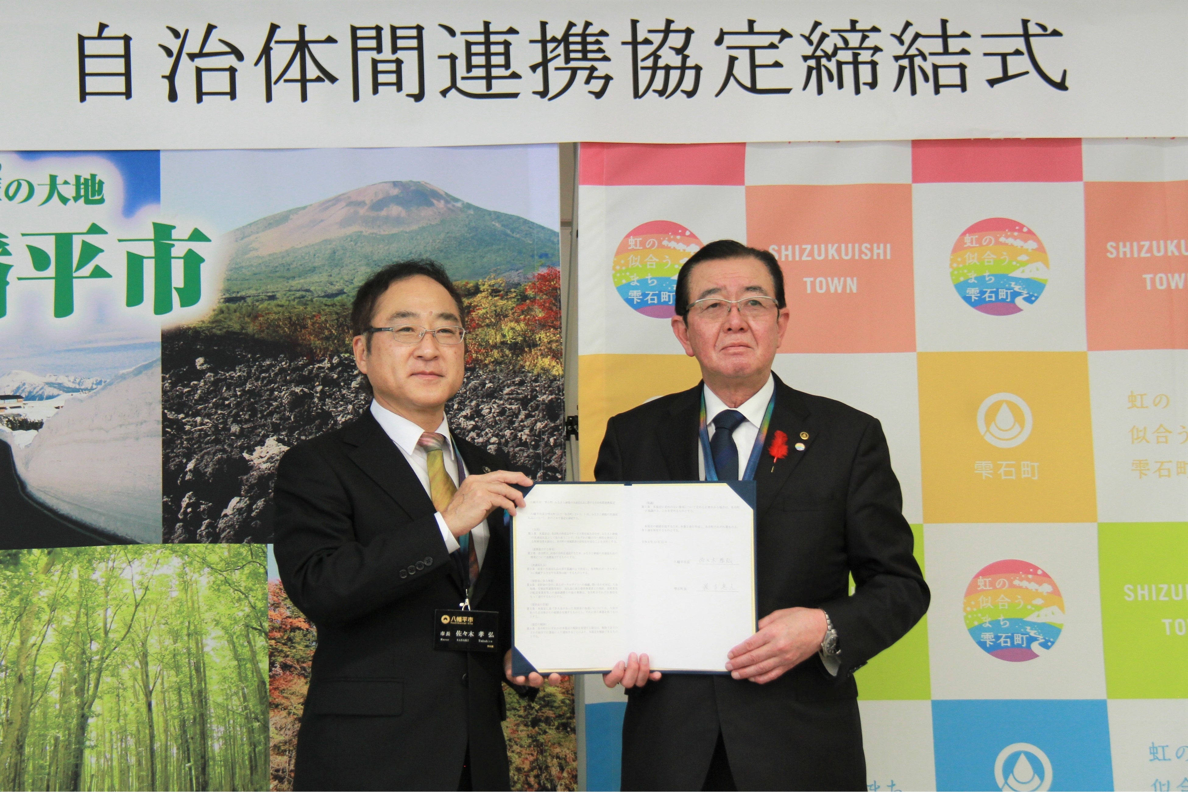 左から 八幡平市長 佐々木孝弘様 雫石町長 猿子恵久様 株式会社マイクロ岩手 中川一様