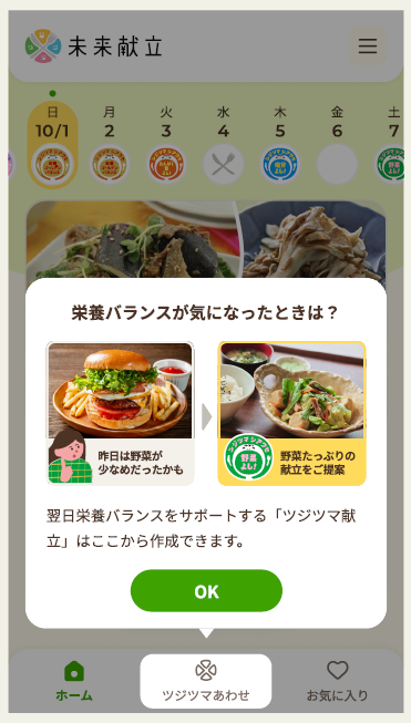 栄養バランスが考慮された献立を最大8日分提案することで、献立立案の悩みを軽減します。栄養バランスの偏った食事をとった場合でも、その内容を入力すると、栄養バランスの“ツジツマあわせ”を実現するための翌日の献立が提案されますので、栄養バランスを気にせずに好きな食事を楽しんでいただくことが可能です。