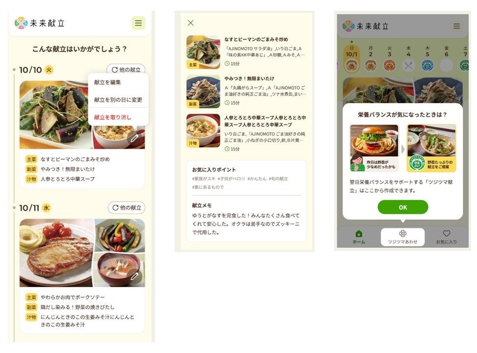 味の素㈱、献立提案サービス「未来献立®」の提供を開始~毎日のストレスから自由に!栄養バランスの“ツジツマあわせ”をご提案~