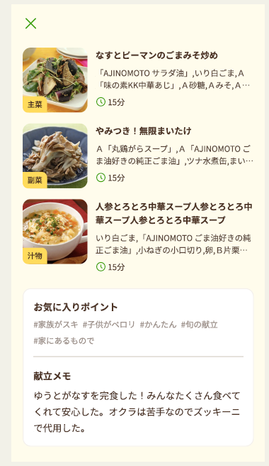 さらに、気に入った献立はお気に入りとして保存できる他、家族の好みに合わせたアレンジの仕方や食事の様子を記入するメモ機能もついており、サービスをカスタマイズしていただくことができます。