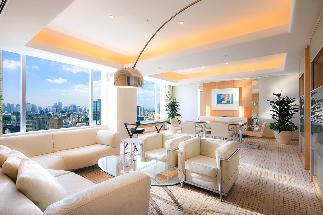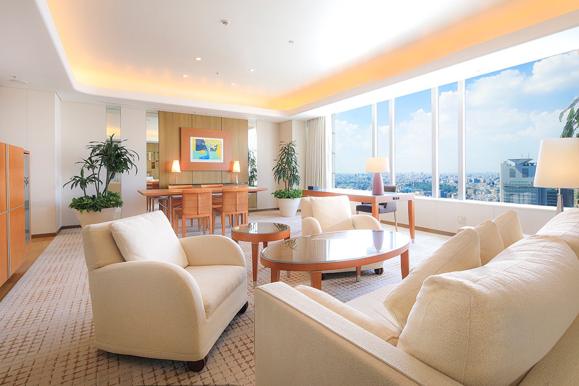 フォーマルな中にも家庭的な温かさを感じさせる室内は、オフホワイトの布張りのソファーやダークブラウンの木目の家具など、落ち着いた雰囲気にあふれています。ベッドはハリウッドツインタイプをご用意。バスルームの床には大理石を用い、木製デッキで囲まれたジャグジーからは都心の摩天楼や皇居、遠く富士山まで見渡すことができます。