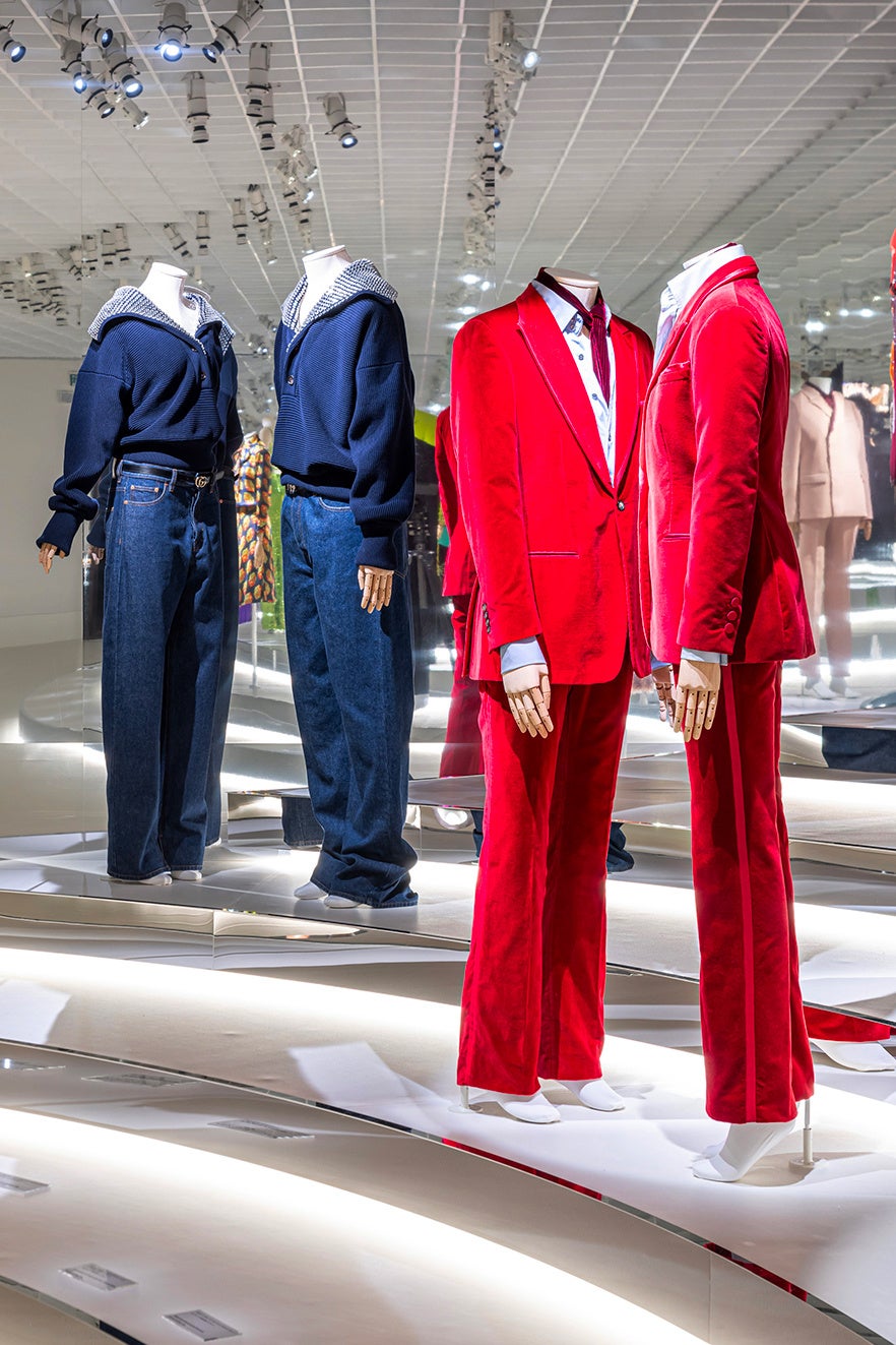 ここでは、1970年代から現在までのグッチのコレクションをまとったマネキンたちがランウェイを歩くモデルのように展示されています。これらのルックはシーズン(年代)ごとではなく、カラーやインスピレーションによって並べられることで、まるで時を超えてダンスをするかのような、新たなつながりが生み出されています。そこには、グッチが自らの価値観、伝統、現代性とのクリエイティブな対話を絶え間なく続けていること、そしてファッションは美しさだけでなく社会的な変革をも促すことができるというブランドの信念が力強く示されています。たとえば、2024年のゴールデングローブ賞授賞式でテイラー・スウィフトが着用したサバト・デ・サルノによるグリーンのドレスは、昼夜を問わないエレガンスというグッチのコンテンポラリーなビジョンを体現しています。アレッサンドロ・ミケーレは、2020年秋冬 コレクションのファッションショーでGGパターンを用いてグッチのコードを現代的に解釈しました。2003年に発表されたトム・フォードによるイエローのプリント入りシルク製のキモノドレスには、日本文化の影響が感じられます。フリーダ・ジャンニーニが2012年にデザインしたチェーン刺繍を施したフラッパードレスはどこまでも繊細で、1996年にトム・フォードが手がけたユニセックスのスーツは享楽主義的な魅惑に満ちています。
