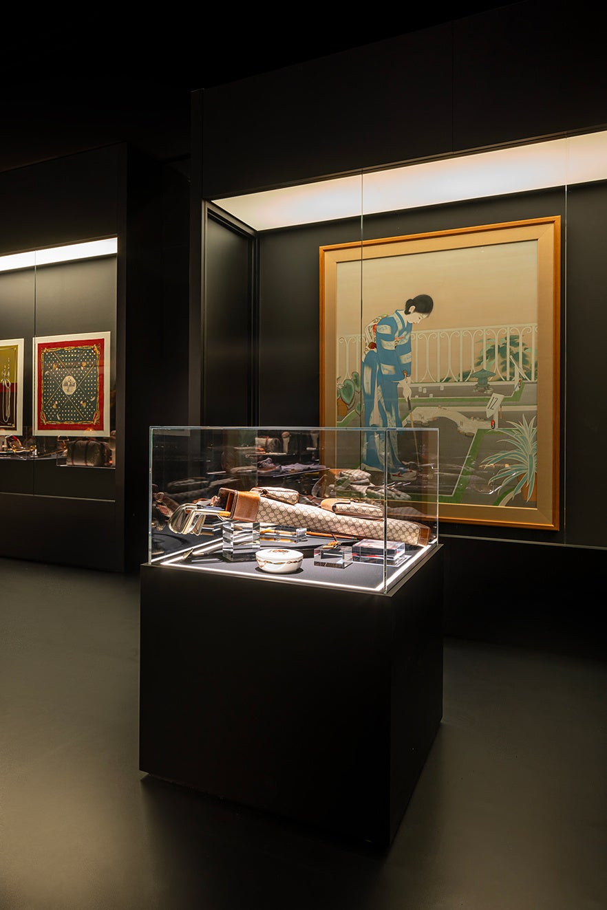 来場者の旅のスタート地点に、エス・デヴリンは、グッチの豊かな歴史における重要な瞬間を映し出す万華鏡のような構造体をデザインしました。この活気あふれるゲートウェイは、その先に広がる最初の展示ルーム「Time Maze」への入口となり、イマーシブな体験を通じてブランドの進化を探求する魅惑的な旅の幕開けを告げます。移り変わるインスタレーションのパターンが、グッチオ・グッチの誕生からサバト・デ・サルノの時代に至るまでのタイムラインをビジュアライズして映し出し、時の迷宮へと導きます。「Time Maze」では、同心円状に配された3つのセクションにグッチがそのカリスマ性とアイデンティティを確立した重要なタイミングやアイテムがマッピングされ、来場者にグッチの過去、現在、未来をそれぞれの視点で感じ取る機会を提供します。常に進化を続け、未来を具現化するグッチ アーカイブのダイナミックな本質が表現されたこの空間を、人々は自由に探索しながら、引き出しや棚、展示ケース、ボックスに収納された資料を自ら発見することができます。たとえば、1920年代後期のワックス仕上げが施されたキャンバス製スーツケースは、グッチオ・グッチがロンドンのザ・サヴォイ ホテルでの経験からインスピレーションを得て、ラゲージの製造からブランドをスタートさせたことを彷彿とさせます。さらに〔グッチ ブロンディ〕バッグの前身である1970年代のバッグは、エレガントで機能的なデザインを求めた時代のスピリットを映し出し、1969年のフローラ プリントのシルクドレスは1966年に誕生して以来愛され続けているフローラの進化を示し、時代を超えて続くグッチのクリエイティビティを照らし出しています。