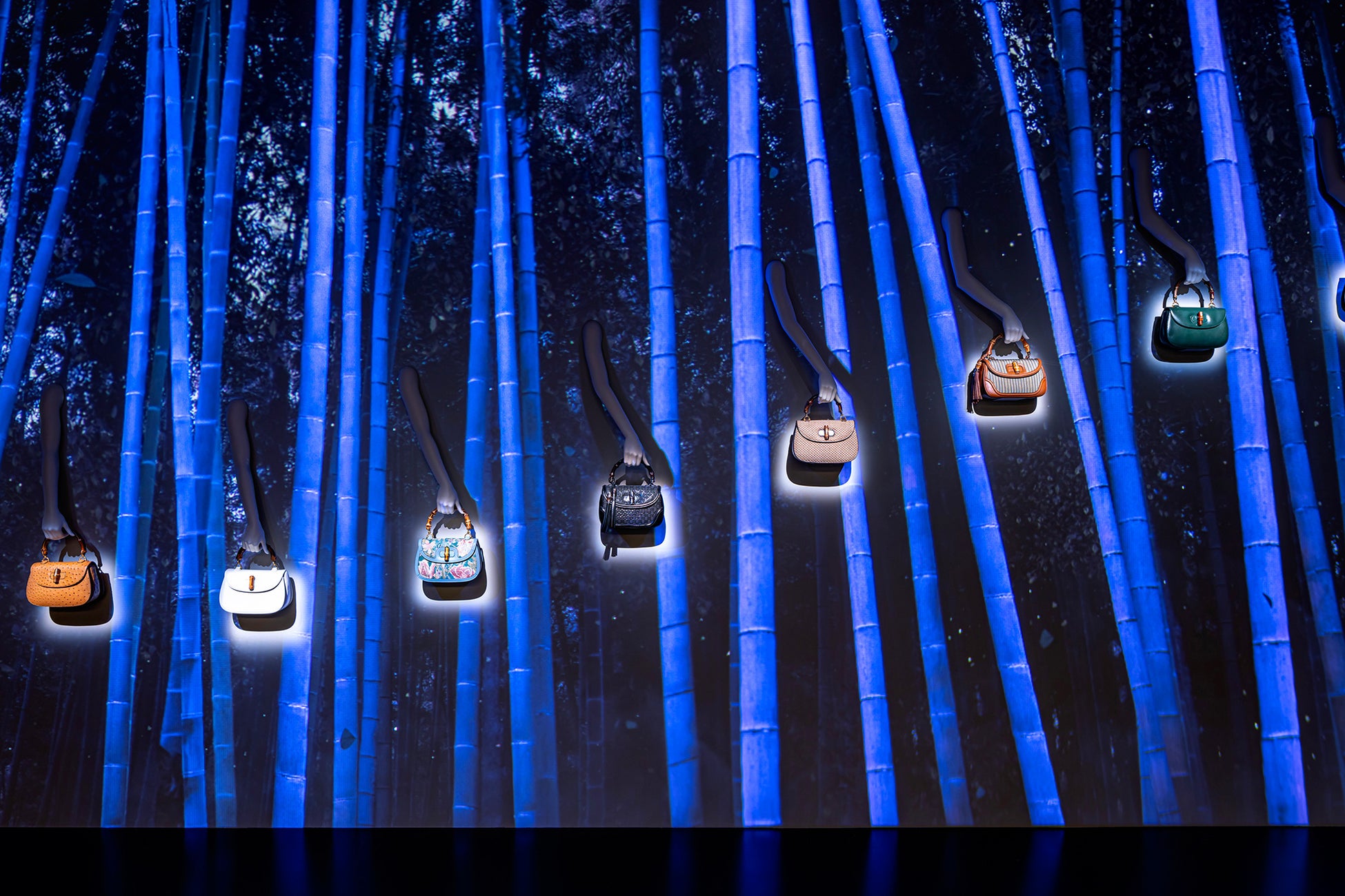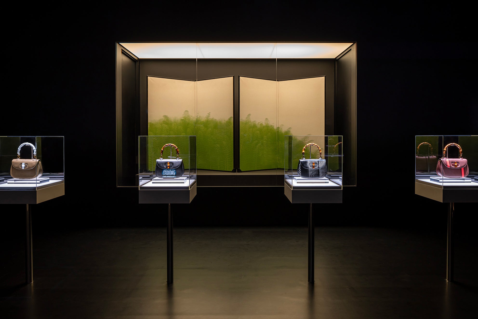 「Bamboo」の展示ルームに一歩入ると、来場者の旅は、グッチの最も象徴的なクリエイションのひとつである〔グッチ バンブー 1947〕バッグの起源へと導かれます。その名が示す通りこのバッグは1947年に誕生しました。その美しい曲線を描くシルエットは馬のサドルの輪郭を模したもので、グッチが初めて乗馬の世界からのインスピレーションをデザインに落とし込んだ製品となりました。ここでは、さまざまな形と素材で作られた〔グッチ バンブー 1947〕バッグを一堂に見ることができます。レザーやキャンバス、ラフィアなど多様なマテリアルで仕立てられ独特のプリントやパターンをまとったバッグは、その一つひとつが〔グッチ バンブー 1947〕バッグの豊かな歴史の物語の1ページを表しています。たとえば1960年代初頭のヘンプキャンバスにバイアデラ ストライプを施したバッグは、その目を引く姿で当時のデザインスピリットを高らかに物語っています。オリジナルのレザーバックのシルエットと構造を保ちながら、ディテールへのこだわりとともに派生していったこれらのバッグは、〔グッチ バンブー 1947〕の多様性とタイムレスな魅力の証となり、グッチの最も重要なアイコンバッグのひとつとしての地位を確固たるものにしています。ここには、グッチの日本上陸60周年を記念するコラボレーションプロジェクト「Bamboo 1947: Then and Now」の一環として、ヴィンテージの〔グッチ バンブー 1947〕バッグを日本の伝統工芸作家とコンテンポラリーアーティストが再生した作品の一部が展示されています。グッチ銀座 ギャラリーで開催されたエキシビションでは、日本が誇る伝統工芸の継承者である、彫金家で人間国宝の桂盛仁(かつら もりひと)氏、陶芸家の中里博恒(なかざと ひろつね)氏、塗師の渡慶次愛(とけし あい)氏に加え、コンテンポラリーアーティストである画家の八重樫ゆい(やえがし ゆい)氏、写真家の森山大道(もりやま だいどう)氏、画家の横山奈美(よこやま なみ)氏が、独自の美学と匠の技で主に1980年代と1990年代のヴィンテージバッグに新たな命を吹き込み創り上げた60点の作品が展示されました。またその中から森山氏と横山氏の作品が、ミラノで開催されたグッチ2025年春夏 ウィメンズ ファッションショーのランウェイでも披露されました。さらに、日本の伝統工芸とグッチのアイコンバッグの対話から生まれた、仙台平、伊勢型紙を用いた甲州印伝、西陣織のHOSOOとのコラボレーションによる作品も展示されています。メインウォールには、竹から生まれ月へと帰っていった美しいかぐや姫の物語を思い起こさせる映像が映し出され、その上部にはいくつものアームが波打つような動きで竹林が風にそよぐ雰囲気を創り出しています。〔グッチ バンブー 1947〕バッグの魅力をさらに印象づけるのが、京都市京セラ美術館のコレクションである井上流光(いのうえ りゅうこう)による作品《籔(やぶ)》(1940年)です。この竹林を描いた屏風は〔グッチ バンブー 1947〕バッグと自然の世界との対話を生み出しながら、マテリアル、クラフツマンシップ、そして人々の暮らしを豊かに育み続ける伝統文化の出会いを際立たせています。