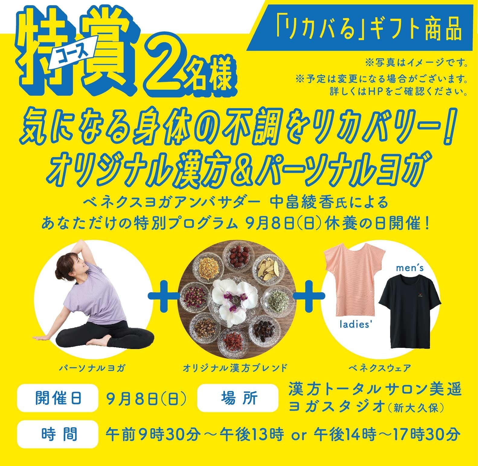 キャンペーン期間中、対象店舗で22,000円(税込)以上をご購入いただいた方にお配りする専用QRコード付きチラシ、または特設サイトより応募いただくと、パーソナルヨガ体験レッスンや、選べる体験ギフト、オリジナル商品(非売品)など、「リカバる(=休養する)」ギフトが抽選で98名様に当たるキャンペーンです。