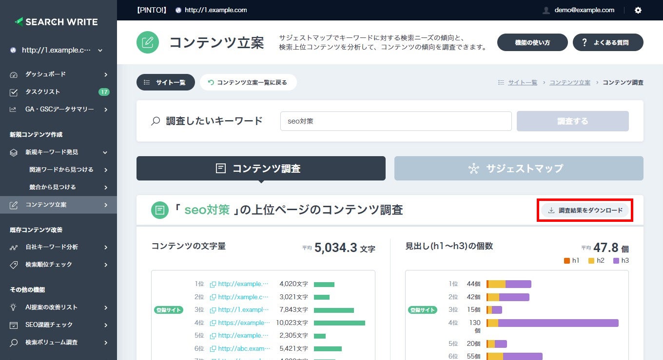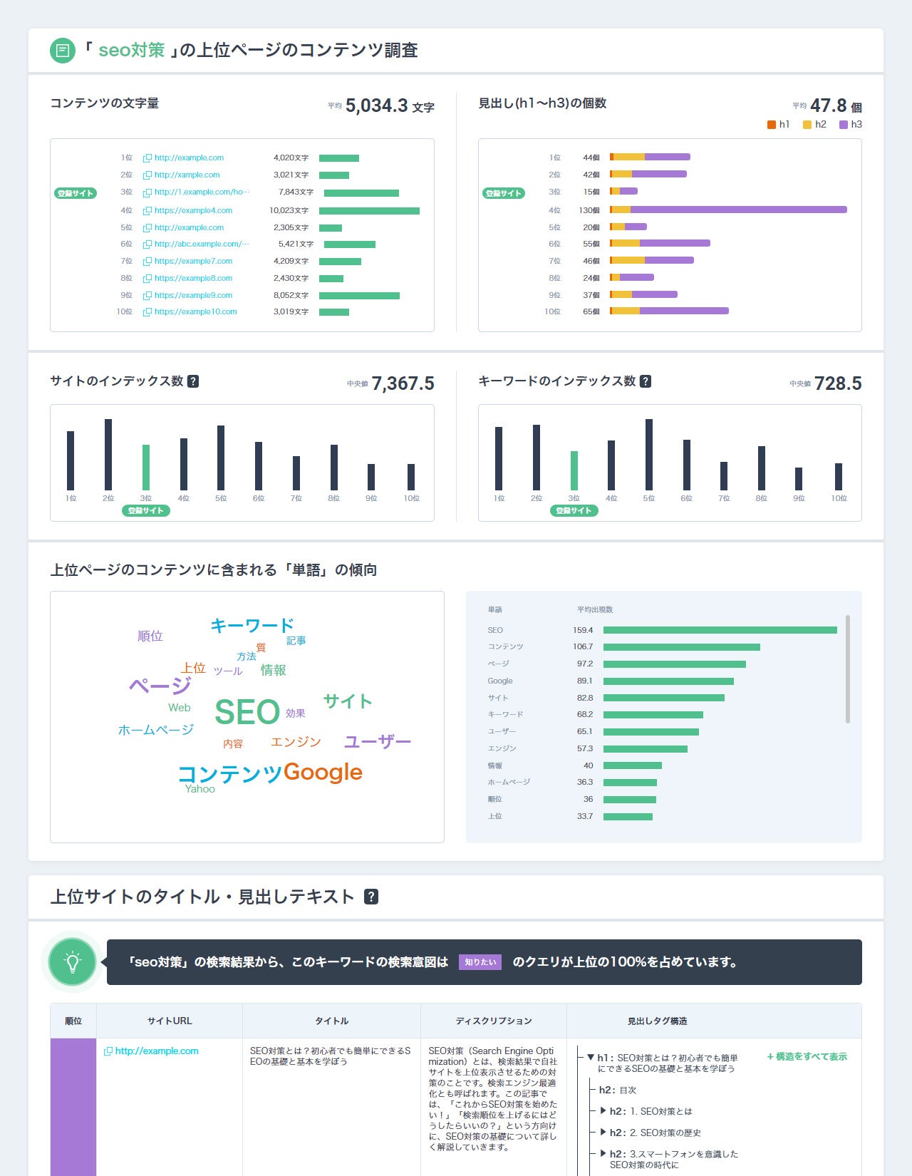 調査したいキーワードを入力すると、そのキーワードの検索上位10コンテンツの構成要素を取得・分析したデータを表示する機能を指します。