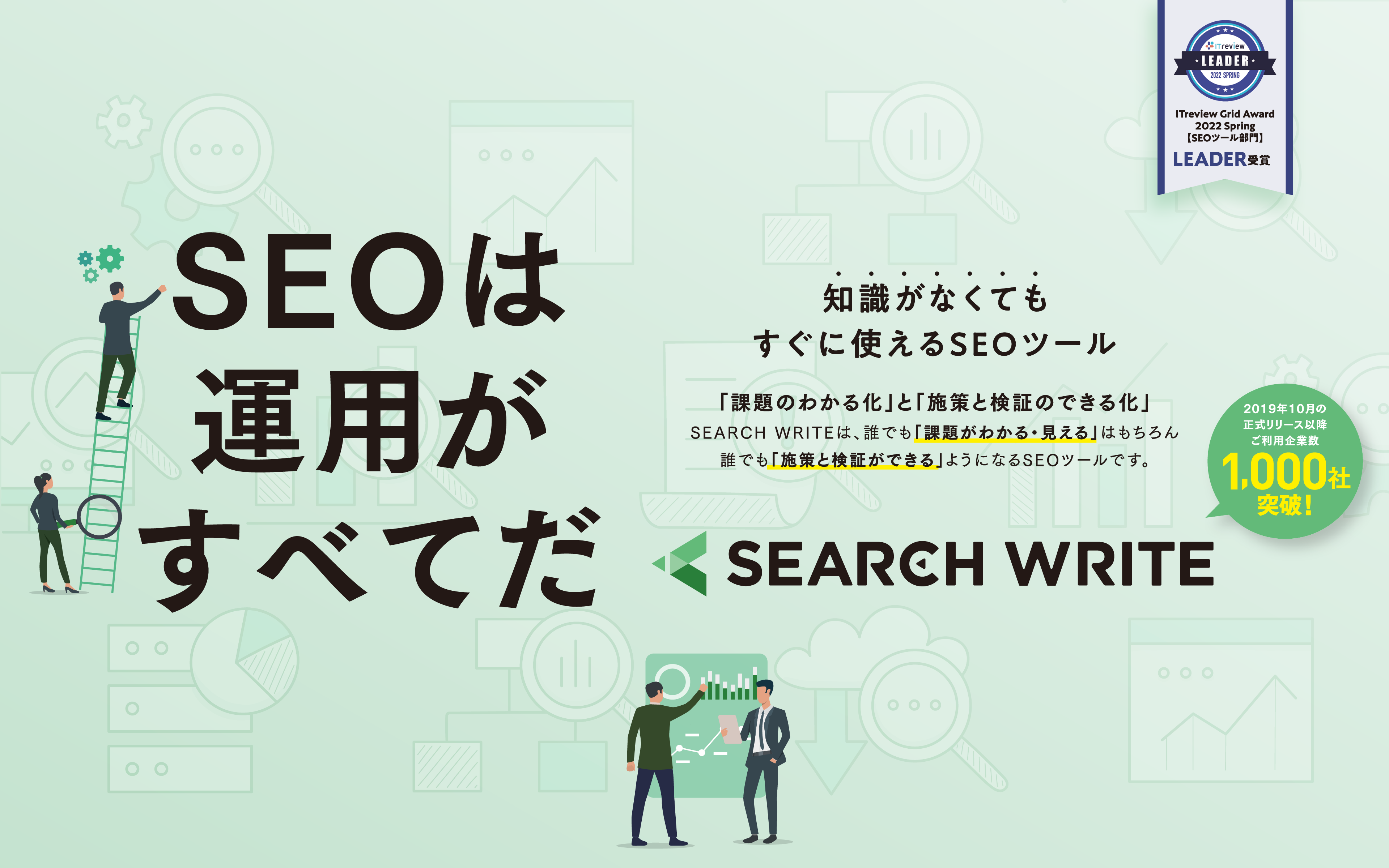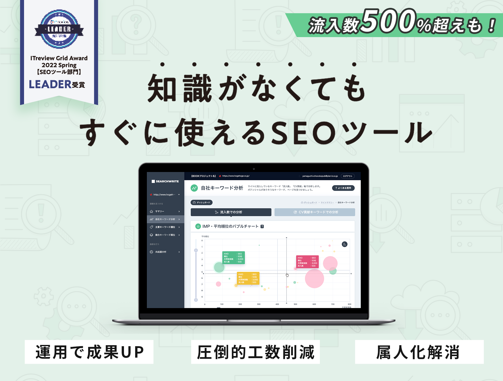 初心者でも「課題がわかる・見える」だけでなく「施策実行と検証ができる」点をご評価いただき、アイティクラウド株式会社が主催するアワード「ITreview Grid Award 2022 Summer」の「SEOツール部門」において、サービスの認知度と満足度が優れたサービスに贈られる「Leader」を4期連続受賞しております。