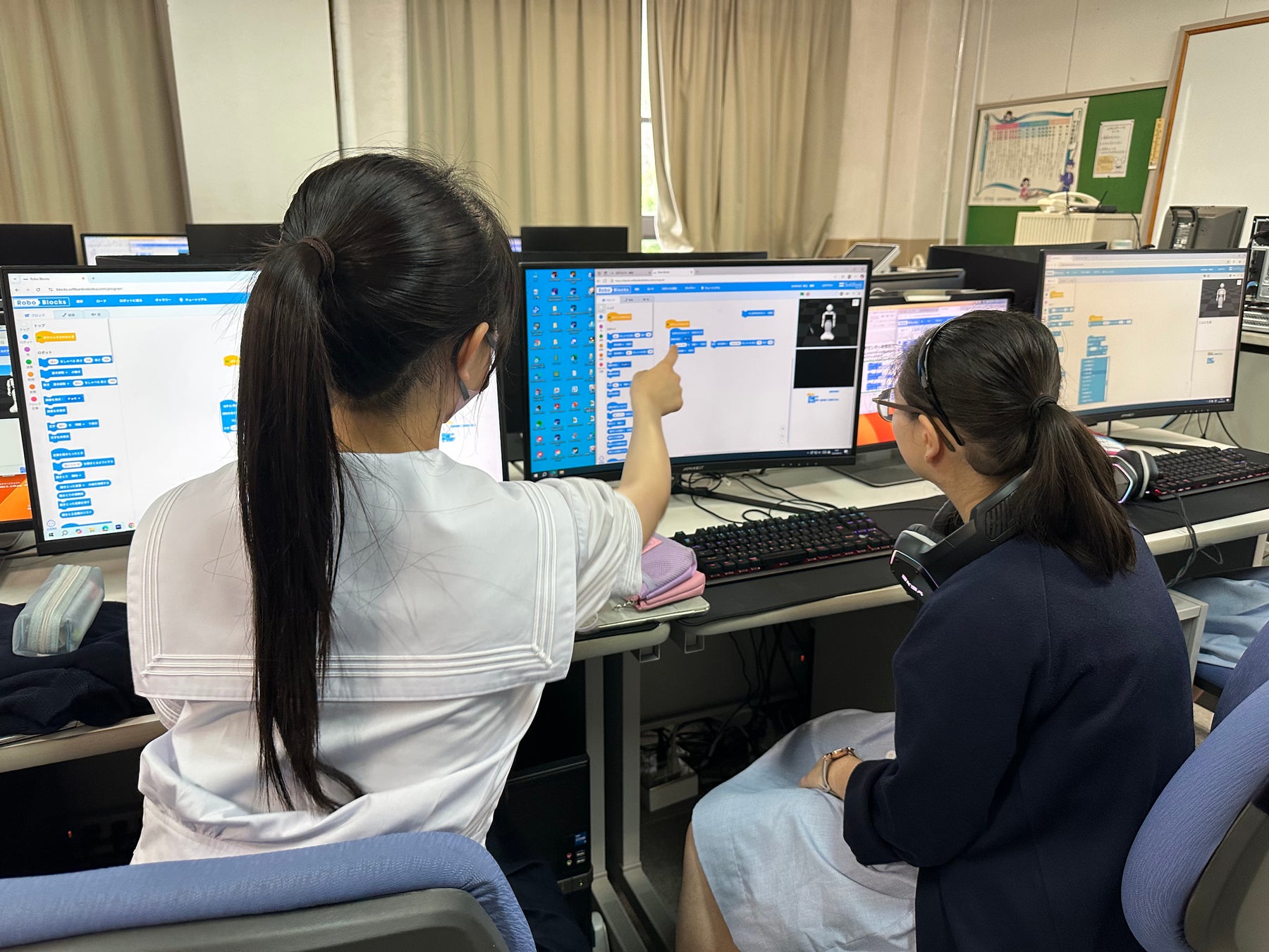 出前授業では、情報Ⅱを選択履修している生徒が、100分にわたり、プログラミングでPepperを操作する方法とプログラミングツール「Robo Blocks」のChatGPT機能を使った自由会話の生成方法を学びました。プログラミングが初めての生徒も、パソコン上のプログラムと機体での再生を繰り返すなど果敢に取り組み、Pepperが思い通りに動いた時には全員が笑顔になりました。また、生徒同士で気づいたことを相互に共有し合う様子も多く見受けられました。