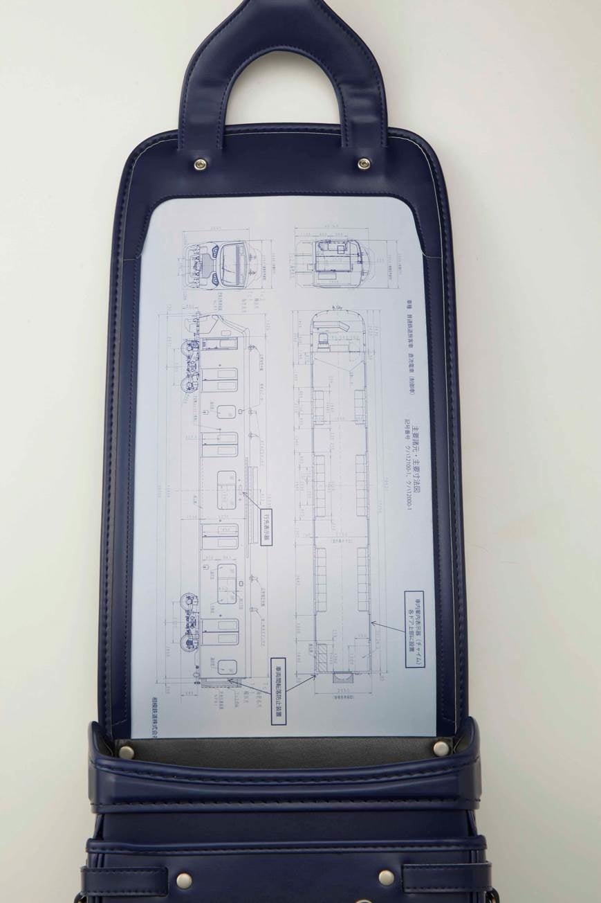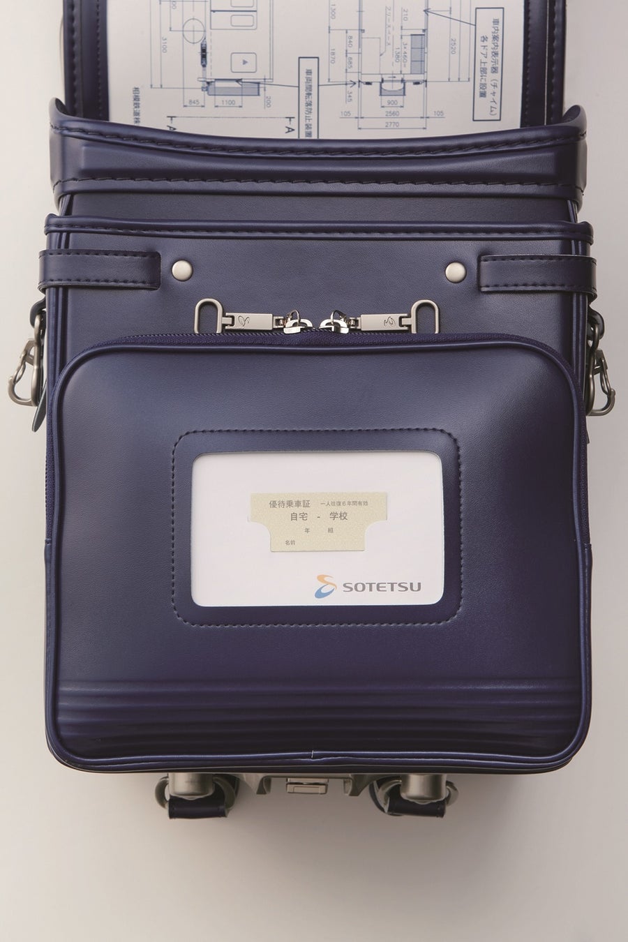 それぞれのランドセルは、横浜をイメージした濃紺色の「ヨコハマネイビーブルー」で全体をカラーリングしており、かぶせの表の反射びょうと刺しゅうには車両の特徴的なライトをデザインしています。また、かぶせの裏には車両の設計図をプリントする他、ファスナーの引き手をつり革のデザインにするなど、随所にこだわって製作しました。さらに、自宅から学校までの切符を模した硬券をご用意していますので、ネーム窓に入れてご利用いただけます。