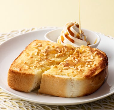 香ばしく焼き上げた自家製アーモンドトーストにメープルシロップやホイップが相性抜群!